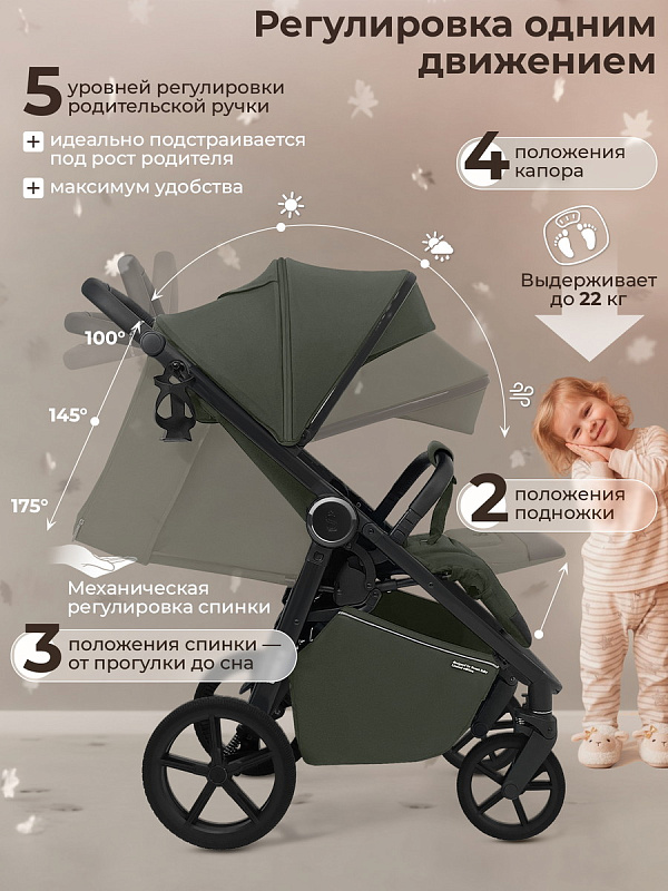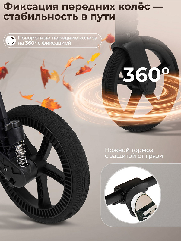 Новые интонационные колеса из высокомолекулярного сшитого полимера с регулируемой подвеской обеспечивают мягкую и комфортную прогулку как в городе, так и на природе. Передние колеса поворотные с функцией фиксации обеспечат отличную маневренность.