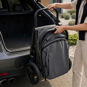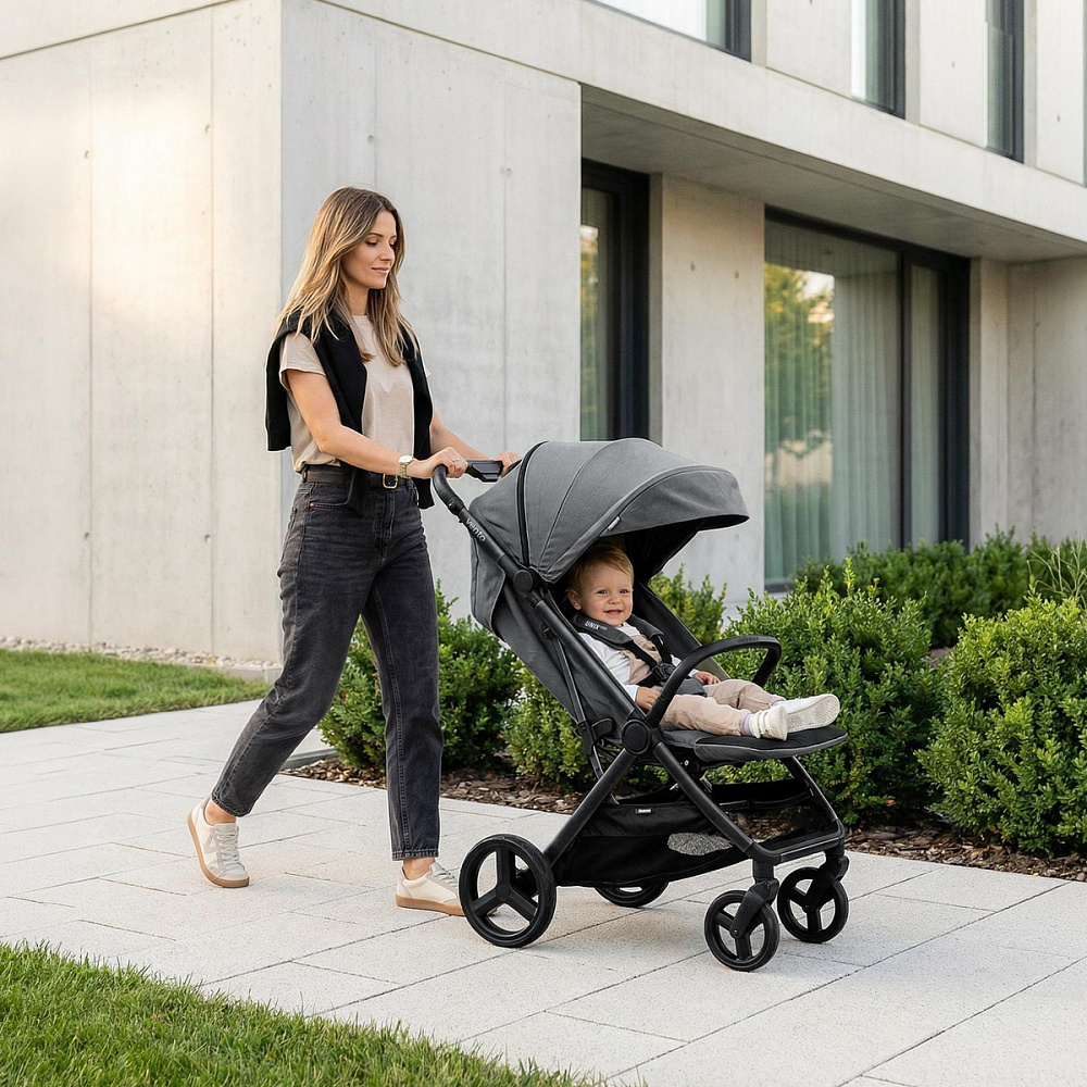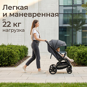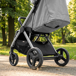 Легкая прогулочная коляска оснащена большими всесезонными задними колесами диаметром 27 см из полиуретана. Они не боятся проколов, обеспечивают отличную проходимость по снегу, песку, гравию и бездорожью. Передние маневренные поворотные колеса на 360° диаметром 16,5 см делают управление максимально легким даже одной рукой. Все колеса быстросъёмные для удобства хранения и чистки. Мягкая пружинная амортизация на всех колесах эффективно гасит удары и вибрации, обеспечивая плавный и мягкий ход даже по неровным дорогам. Это гарантирует спокойный сон ребёнка во время прогулки.