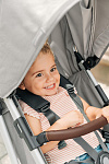 Защита от солнца и непогоды обеспечивается удлиняемым капюшоном с ультрафиолетовой защитой UPF 50+. Этот капюшон эффективно защищает малыша от прямых солнечных лучей, перегрева и ослепляющего света. Встроенное смотровое окошко с вентиляцией позволяет наблюдать за ребёнком, не раскрывая полностью капюшон, а также обеспечивает циркуляцию воздуха внутри коляски, предотвращая перегрев. Пятиточечный ремень безопасности надёжно фиксирует малыша в коляске, обеспечивая максимальную безопасность во время прогулок. Мягкий бампер предохраняет ребенка от случайных падений и добавляет ему чувства защищенности.