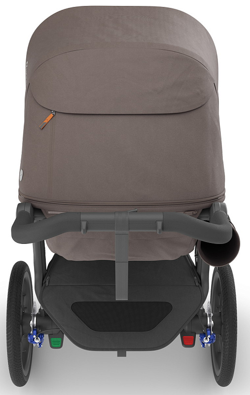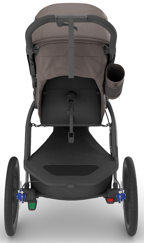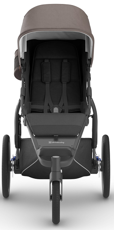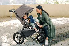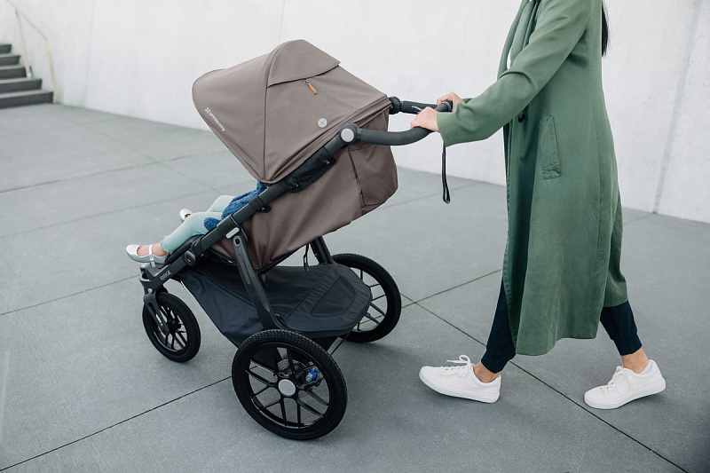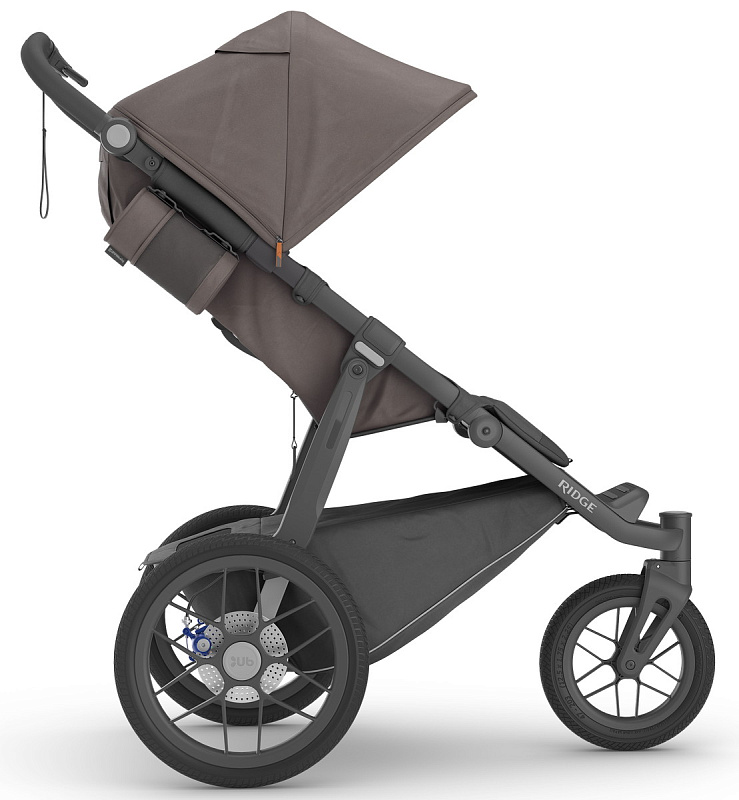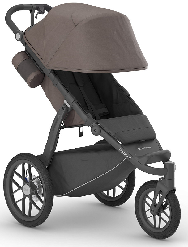 Трехколесная UPPAbaby RIDGE имеет поворотное переднее колесо и два задних колеса большего диаметра. Такая конструкция обеспечивает максимальную устойчивость даже при высокой скорости движения.