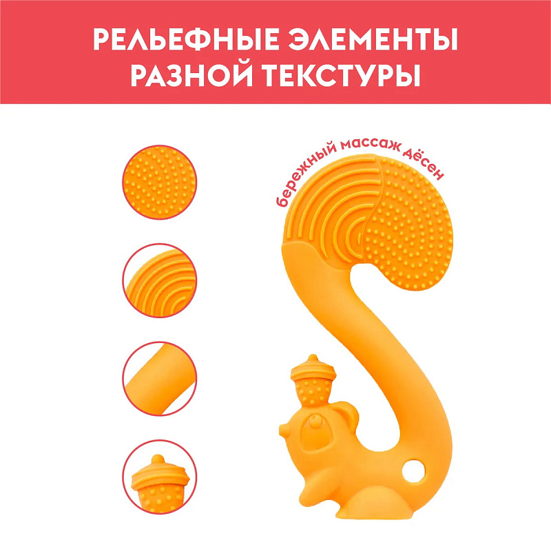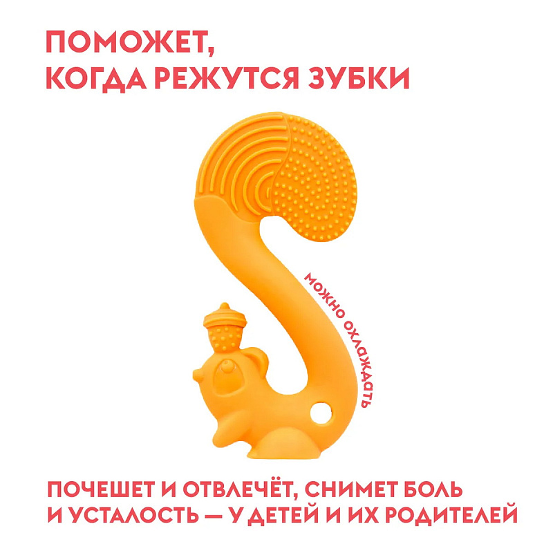«Белка» от Mombella – это грызунок-прорезыватель для мальчиков и девочек из гипоаллергенного мягкого силикона.