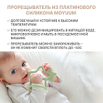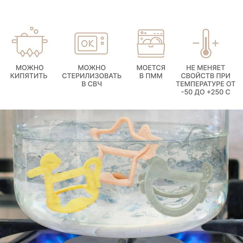Moyuum – незаменимый помощник в период прорезывания зубов у младенцев. Прорезыватель эффективно устраняет неприятные болезненные ощущения, зуд и дискомфорт. Его выступающие части отлично подходят для мягкого массажа десен. В результате ребенок не сосет пальцы и обучается правильной привычке гигиены полости рта. В то же время милая привлекательная игрушка помогает отвлечь внимание и успокоить малыша, а ее спокойные красивые цвета приятны глазу. Мы разработали прорезыватель специальной эргономичной формы, без каких-либо съемных деталей, что обеспечивает детям полную безопасность. Аксессуар удобно фиксируется на руке и не выпадает из ладошки. Его небольшие размеры и легкий вес оптимальны для маленькой детской кисти. Особый дизайн позволяет чесалке стоять на столе. Жевательная поверхность при этом ни с чем не соприкасается и дольше остается чистой. Изделие изготовлено из премиального платинового силикона, отличающегося стабильностью при разных температурах от -50 до 200°С, поэтому его можно охлаждать и подмораживать. Этот качественный, абсолютно безопасный материал не имеет постороннего запаха и привкуса. Наш силиконовый прорезатель не деформируется, от него невозможно откусить кусочек, его легко мыть и стерилизовать любым способом. Выдерживает обработку в пмм и свч, стерилизацию паром и кипячением. Грызунок – идеальный подарок для новорожденных!