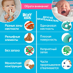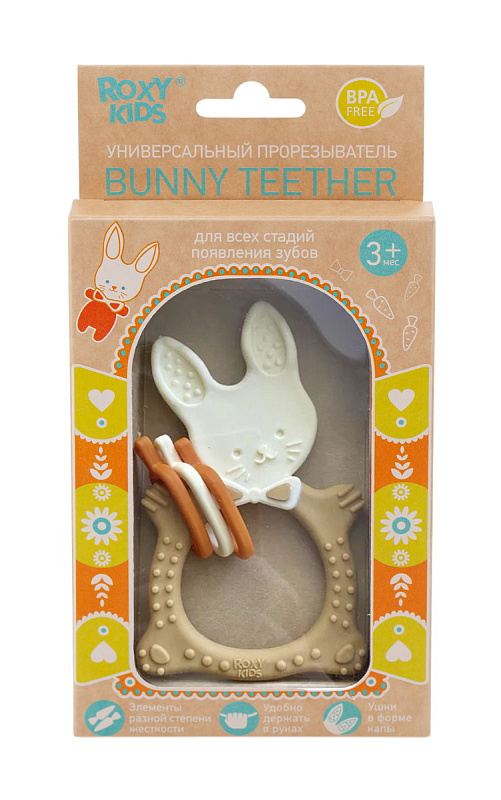Прорезыватель для зубов BUNNY TEETHER от ROXY-KIDS подходит для всех стадий прорезывания зубов у малышей. Он состоит из элементов различной степени жесткости, что позволяет малышу использовать на протяжении всего времени прорезывания. На начальном этапе, когда у малыша раздражены десны, он может чесать их о мягкую рельефную голову зайчика. На завершающем этапе малыш сможет грызть более твердое тело и твердые морковки для лучшего эффекта. BUNNY TEETHER пригодится даже при прорезывания жевательных зубов, потому что ушки зайца по форме похожи на капу, что позволит малышу снять зуд с самых дальних десен. Прорезыватель сделан из безопасных гипоаллергенных материалов (термоэластопласта и полипропилена), так что ребенок может грызть его целыми днями. Еще одна отличительная особенность BUNNY TEETHER это тело, сделанное в форме кольца, которое малыш сможет удобно держать. В ассортименте ROXY-KIDS прорезыватели BUNNY TEETHER представлены в нескольких цветах. Соответствует стандартам безопасности товаров для детей.
