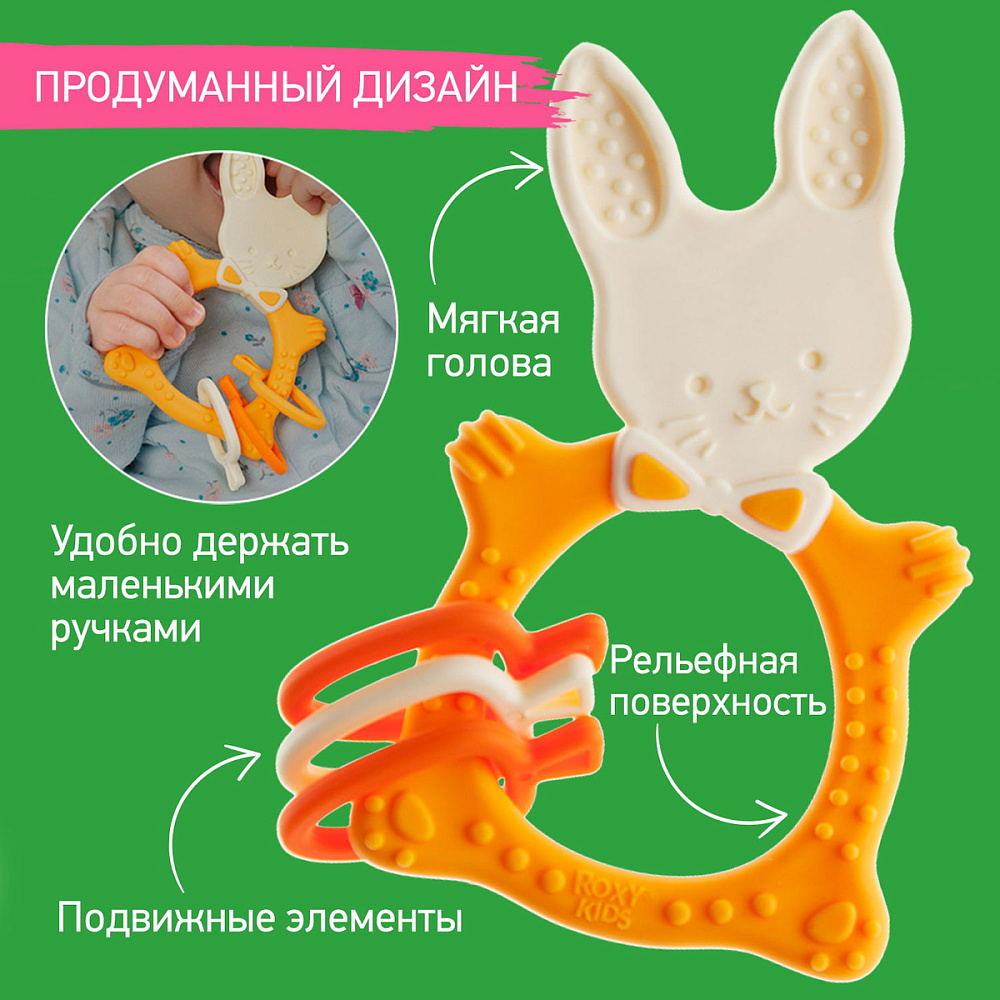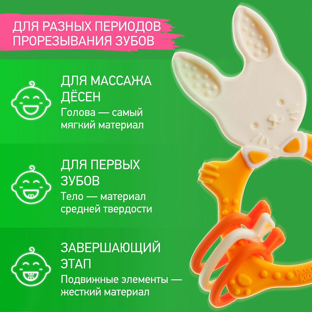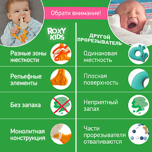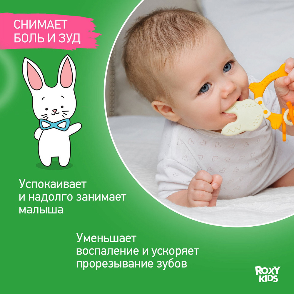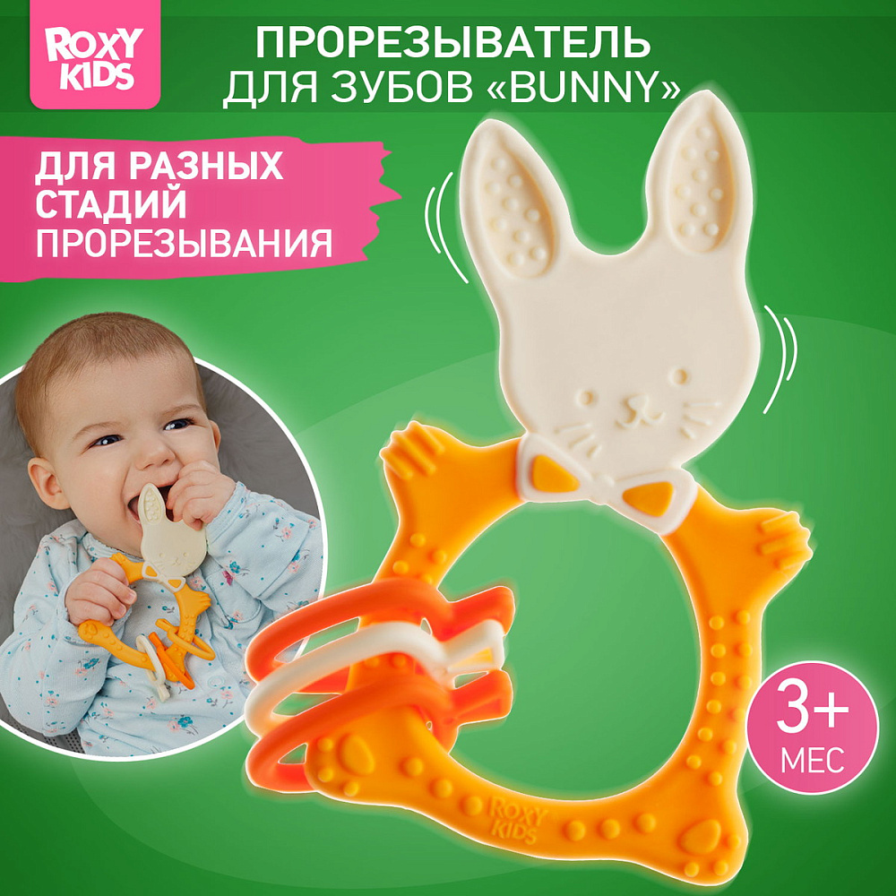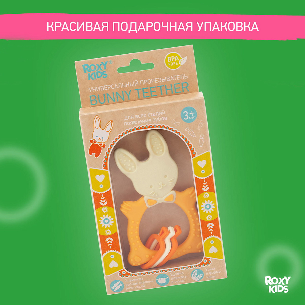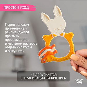 Прорезыватель для зубов BUNNY TEETHER от ROXY-KIDS подходит для всех стадий прорезывания зубов у малышей. Он состоит из элементов различной степени жесткости, что позволяет малышу использовать на протяжении всего времени прорезывания. На начальном этапе, когда у малыша раздражены десны, он может чесать их о мягкую рельефную голову зайчика. На завершающем этапе малыш сможет грызть более твердое тело и твердые морковки для лучшего эффекта. BUNNY TEETHER пригодится даже при прорезывания жевательных зубов, потому что ушки зайца по форме похожи на капу, что позволит малышу снять зуд с самых дальних десен. Прорезыватель сделан из безопасных гипоаллергенных материалов (термоэластопласта и полипропилена), так что ребенок может грызть его целыми днями. Еще одна отличительная особенность BUNNY TEETHER это тело, сделанное в форме кольца, которое малыш сможет удобно держать. В ассортименте ROXY-KIDS прорезыватели BUNNY TEETHER представлены в нескольких цветах. Соответствует стандартам безопасности товаров для детей.