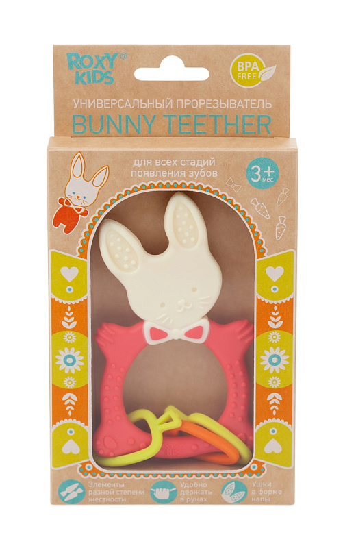 Прорезыватель для зубов BUNNY TEETHER от ROXY-KIDS подходит для всех стадий прорезывания зубов у малышей. Он состоит из элементов различной степени жесткости, что позволяет малышу использовать на протяжении всего времени прорезывания. На начальном этапе, когда у малыша раздражены десны, он может чесать их о мягкую рельефную голову зайчика. На завершающем этапе малыш сможет грызть более твердое тело и твердые морковки для лучшего эффекта. BUNNY TEETHER пригодится даже при прорезывания жевательных зубов, потому что ушки зайца по форме похожи на капу, что позволит малышу снять зуд с самых дальних десен. Прорезыватель сделан из безопасных гипоаллергенных материалов (термоэластопласта и полипропилена), так что ребенок может грызть его целыми днями. Еще одна отличительная особенность BUNNY TEETHER это тело, сделанное в форме кольца, которое малыш сможет удобно держать. В ассортименте ROXY-KIDS прорезыватели BUNNY TEETHER представлены в нескольких цветах. Соответствует стандартам безопасности товаров для детей.