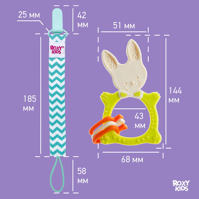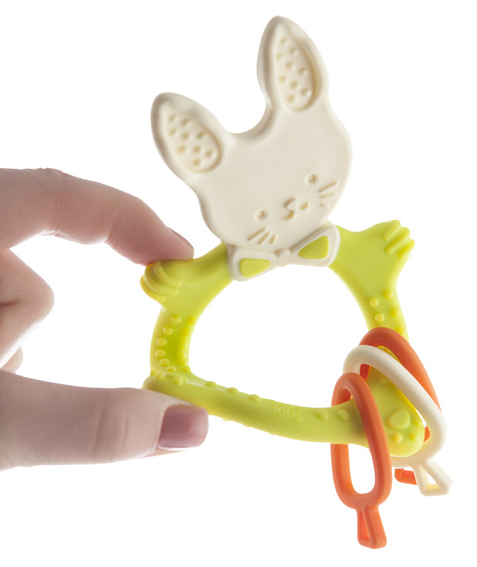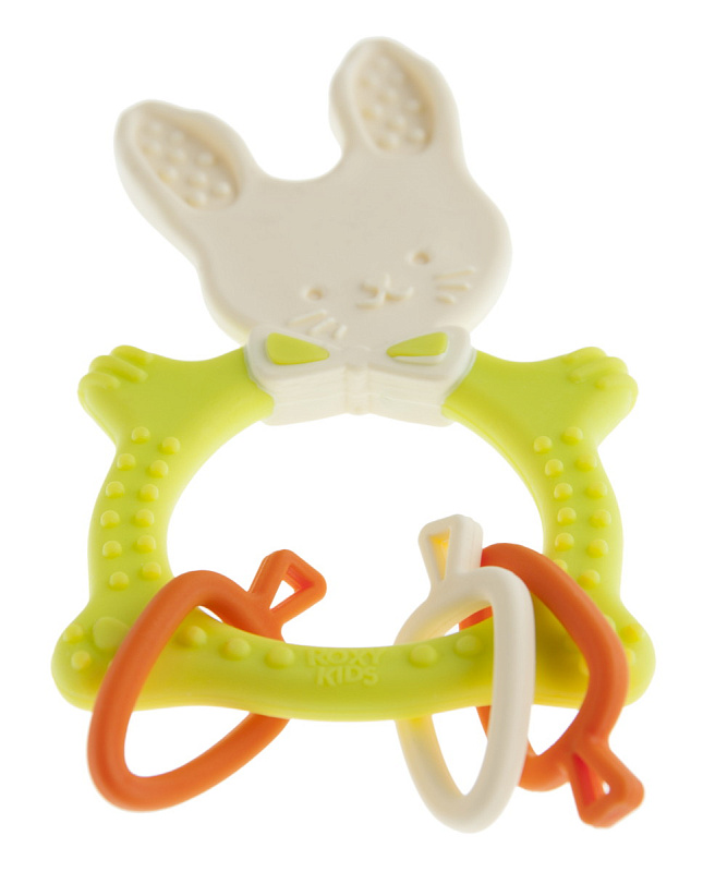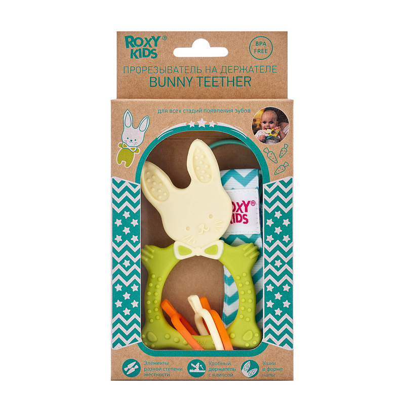 Прорезыватель для зубов BUNNY TEETHER от ROXY-KIDS подходит для всех стадий прорезывания зубов благодаря элементам различной степени жесткости. На начальном этапе, когда у малыша раздражены десны, он может чесать их о мягкую рельефную голову зайчика. На завершающем этапе малыш сможет грызть более твердое тело и твердые морковки. BUNNY TEETHER пригодится даже при прорезывания жевательных зубов, потому что ушки зайца по форме похожи на капу, что позволит малышу снять зуд с самых дальних десен. Прорезыватель сделан из безопасных гипоаллергенных материалов термоэластопласта и полипропилена. Тело BUNNY TEETHER сделано в форме кольца, которое малыш сможет удобно держать. Специальный держатель избавит ребенка от риска потерять или испачкать прорезыватель. Один конец держателя прикрепляется к прорезывателю, а второй при помощи специальной клипсы пристегивается к одежде ребенка. Держатель выполнен из двух слоев полиэстера, прочно сшитых вместе, поэтому он не износится и не порвется.