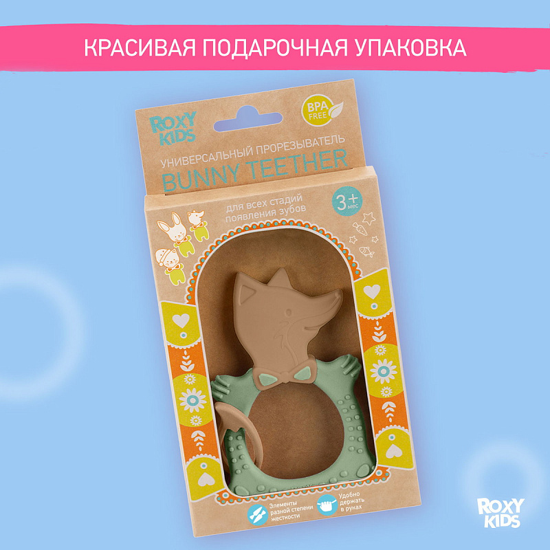 Прорезыватель для зубов FOX TEETHER от ROXY-KIDS подходит для всех стадий прорезывания зубов у малышей. Он состоит из элементов различной степени жесткости, что позволяет малышу использовать на протяжении всего времени прорезывания. На начальном этапе, когда у малыша раздражены десны, он может чесать их о мягкую рельефную голову лисенка. На завершающем этапе малыш сможет грызть более твердое тело и твердый хвост для лучшего эффекта. Прорезыватель сделан из безопасных гипоаллергенных материалов (термоэластопласта и полипропилена), так что ребенок может грызть его целыми днями. Еще одна отличительная особенность FOX TEETHER это тело, сделанное в форме кольца, которое малыш сможет удобно держать. В ассортименте ROXY-KIDS прорезыватели FOX TEETHER представлены в нескольких цветах. Соответствует стандартам безопасности товаров для детей.