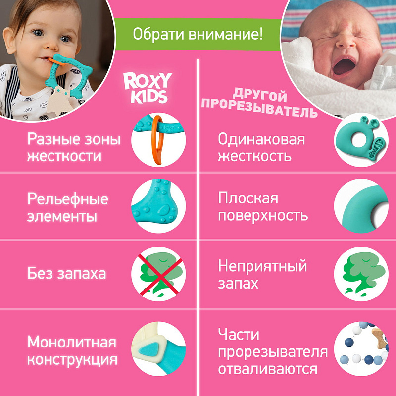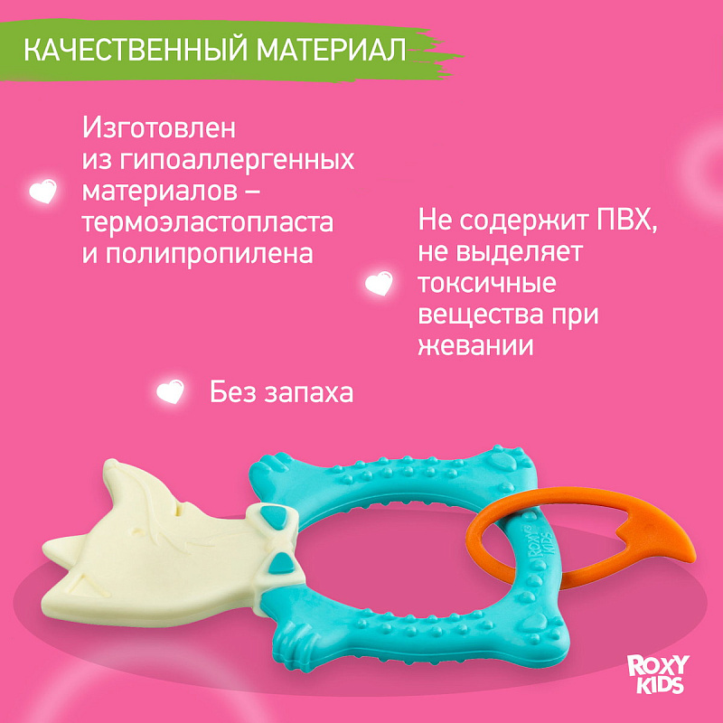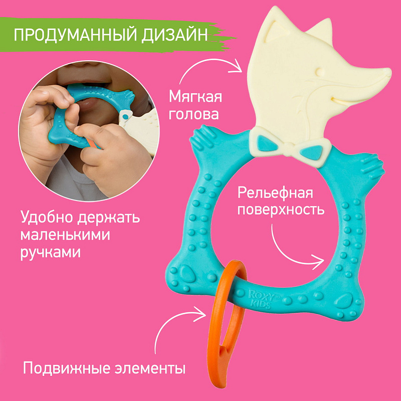 Прорезыватель для зубов FOX TEETHER от ROXY-KIDS подходит для всех стадий прорезывания зубов у малышей. Он состоит из элементов различной степени жесткости, что позволяет малышу использовать на протяжении всего времени прорезывания. На начальном этапе, когда у малыша раздражены десны, он может чесать их о мягкую рельефную голову лисенка. На завершающем этапе малыш сможет грызть более твердое тело и твердый хвост для лучшего эффекта. Прорезыватель сделан из безопасных гипоаллергенных материалов (термоэластопласта и полипропилена), так что ребенок может грызть его целыми днями. Еще одна отличительная особенность FOX TEETHER это тело, сделанное в форме кольца, которое малыш сможет удобно держать. В ассортименте ROXY-KIDS прорезыватели FOX TEETHER представлены в нескольких цветах. Соответствует стандартам безопасности товаров для детей.