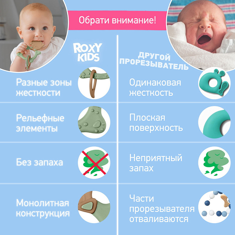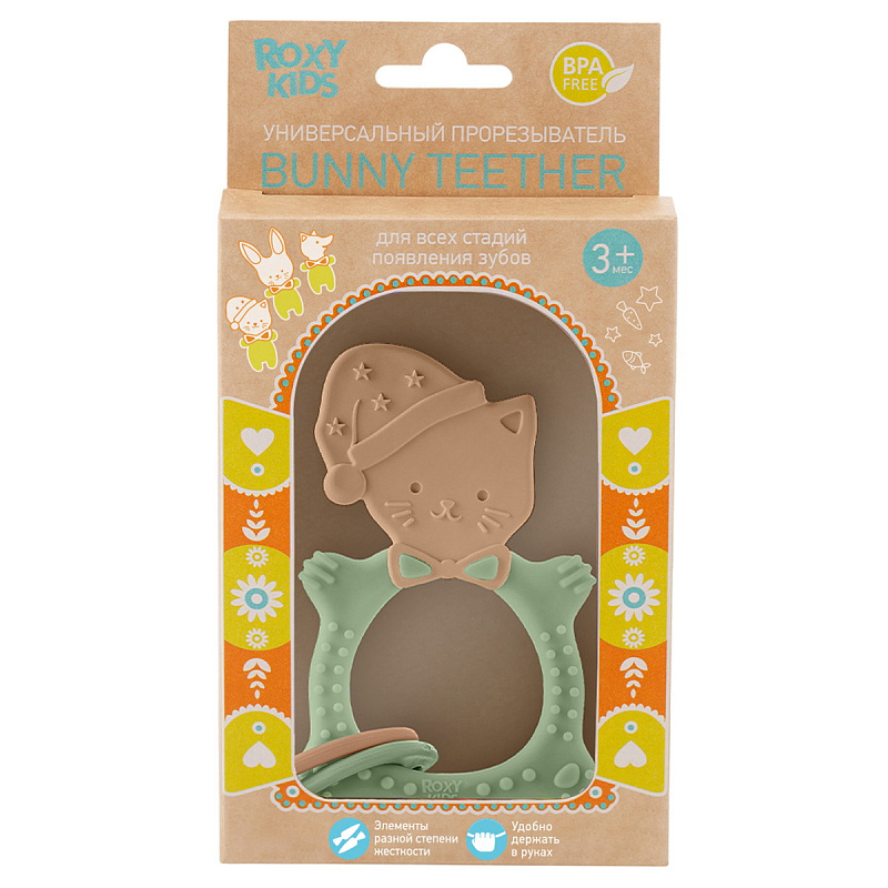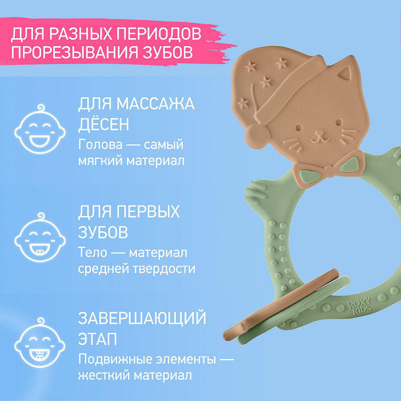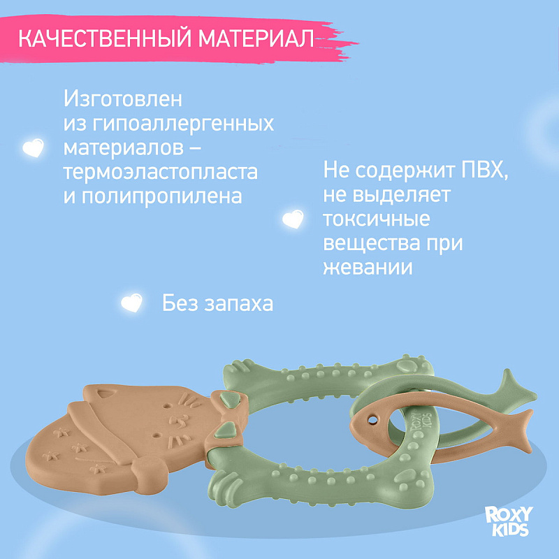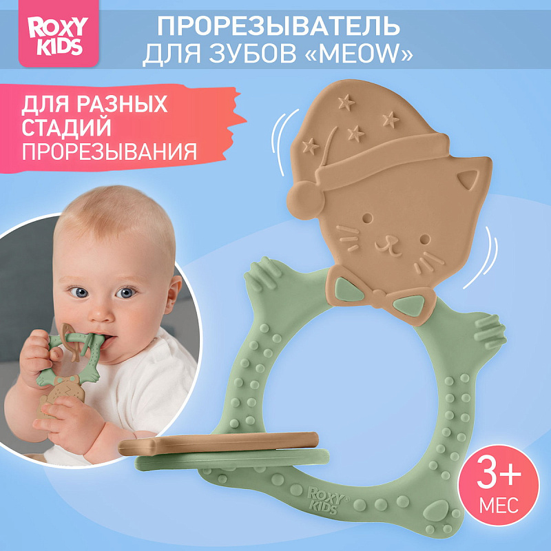 Прорезыватель для зубов MEOW TEETHER от ROXY-KIDS подходит для всех стадий прорезывания зубов у малышей. Он состоит из элементов различной степени жесткости, что позволяет его использовать на протяжении всего времени прорезывания. На начальном этапе, когда у малыша раздражены десны, он может чесать их о мягкую рельефную голову котенка. На завершающем этапе малыш сможет грызть более твердое тело и жесткие элементы в виде рыбок для лучшего эффекта. Прорезыватель сделан из безопасных гипоаллергенных материалов (термоэластопласта и полипропилена), так что ребенок может грызть его целыми днями. Еще одна отличительная особенность MEOW TEETHER – это тело, сделанное в форме кольца, которое малыш сможет удобно держать. В ассортименте ROXY-KIDS прорезыватели MEOW TEETHER представлены в нескольких цветах. Соответствует стандартам безопасности товаров для детей.