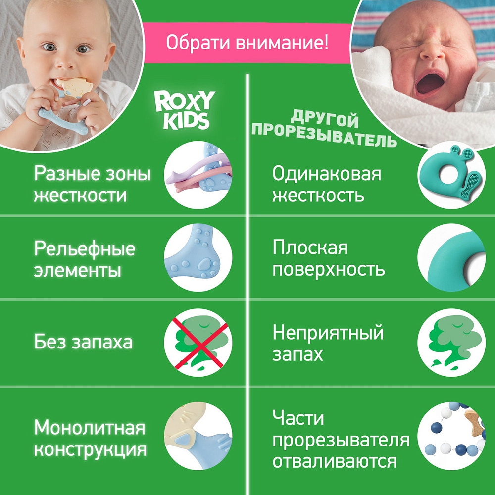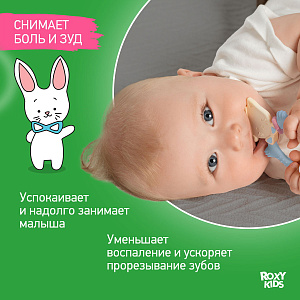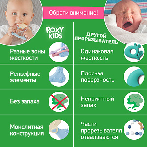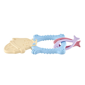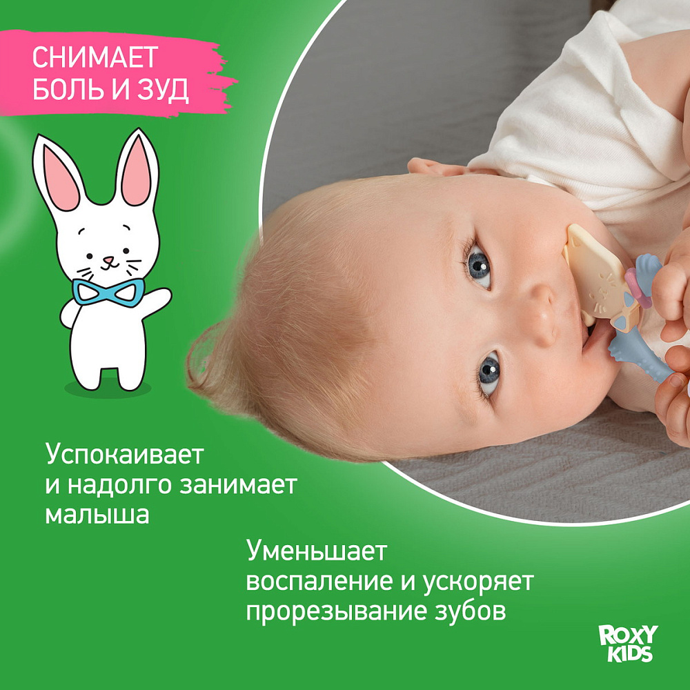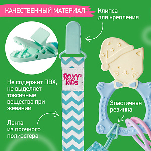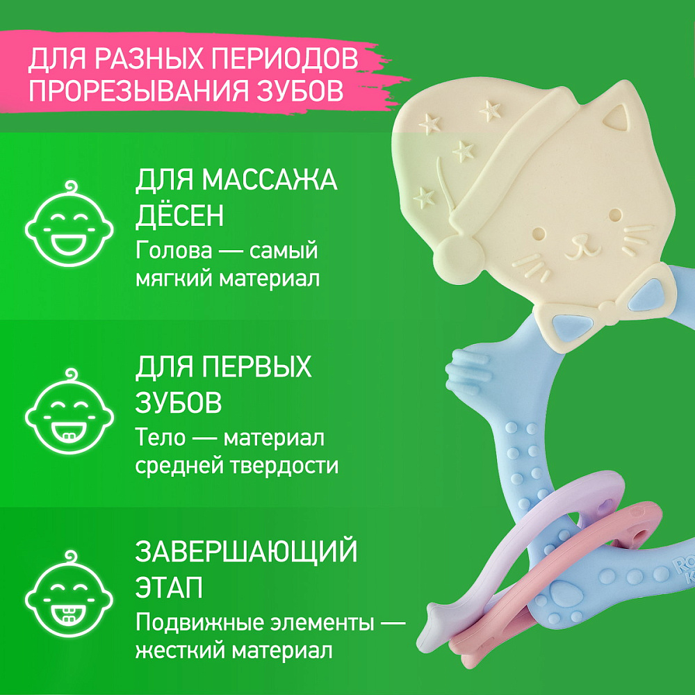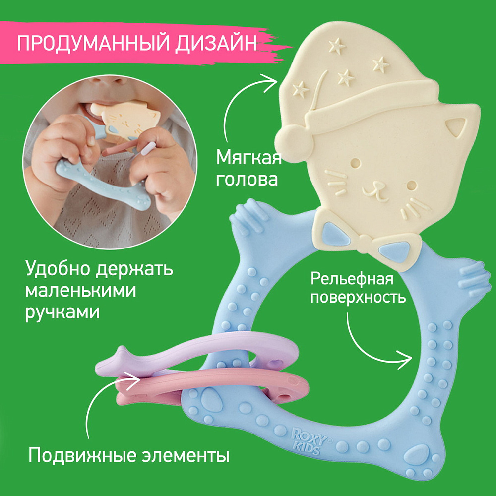 Прорезыватель для зубов MEOW TEETHER от ROXY-KIDS подходит для всех стадий прорезывания зубов у малышей. Он состоит из элементов различной степени жесткости, что позволяет его использовать на протяжении всего времени прорезывания. На начальном этапе, когда у малыша раздражены десны, он может чесать их о мягкую рельефную голову котенка. На завершающем этапе малыш сможет грызть более твердое тело и жесткие элементы в виде рыбок. Прорезыватель сделан из безопасных гипоаллергенных материалов (термоэластопласта и полипропилена), так что ребенок может грызть его целыми днями. Еще одна особенность MEOW TEETHER – это тело, сделанное в форме кольца, которое малыш сможет удобно держать. Специальный держатель избавит ребенка от риска потерять или испачкать прорезыватель. Один конец держателя прикрепляется к прорезывателю, а второй при помощи специальной клипсы пристегивается к одежде ребенка. Держатель выполнен из двух слоев полиэстера, прочно сшитых вместе, поэтому он не износится и не порвется.