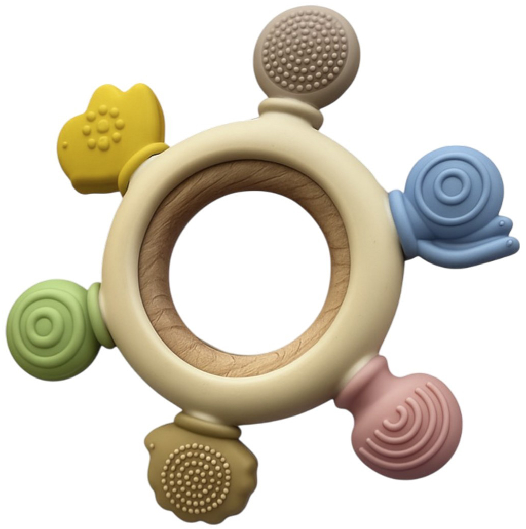 Силиконовый прорезыватель с деревянным кольцом в форме штурвала. Создан для бережной заботы о малыше в период прорезывания зубов. Шесть разных рельефов бережно массируют раздраженные десны, снимают зуд и дискомфорт. Форма штурвала развивает мелкую моторику и знакомит малыша с новыми текстурами. Прорезыватель выполнен из безопасных гипоаллергенных материалов — мягкого пищевого силикона и натурального бука.