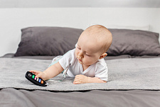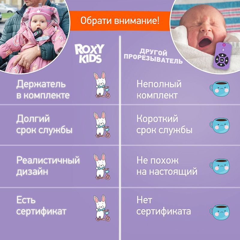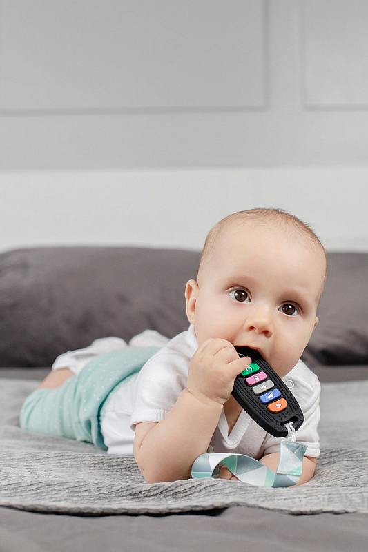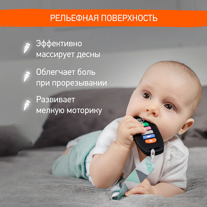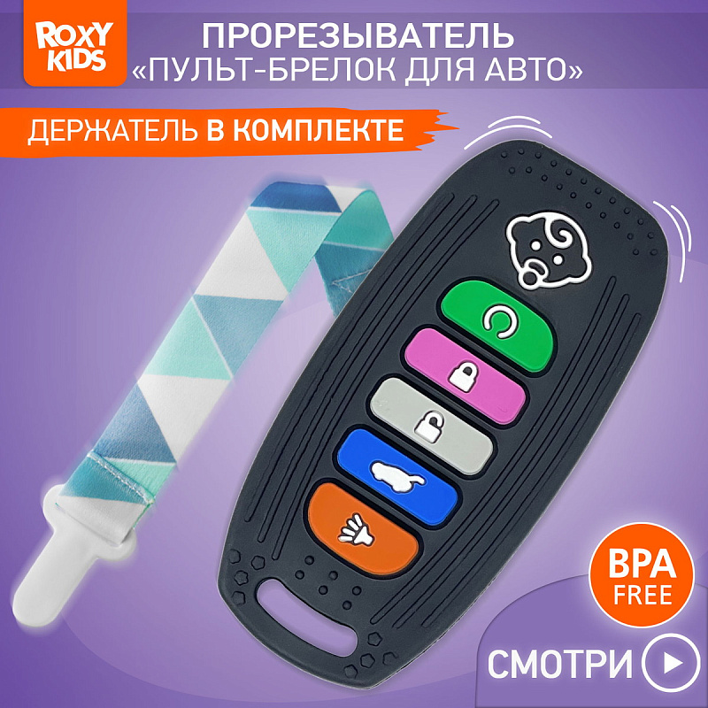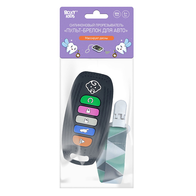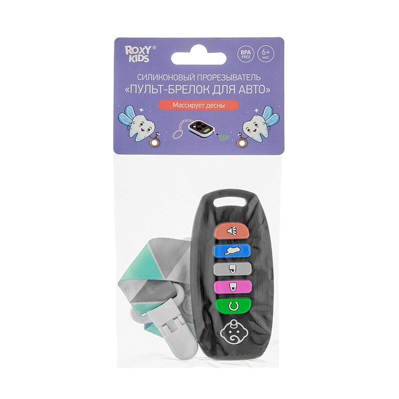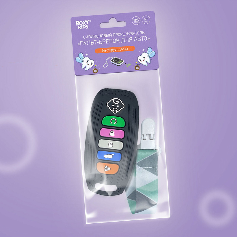 Реалистичный прорезыватель в виде пульта для автосигнализации – яркая и интересная игрушка от ROXY-KIDS, которая порадует вашего малыша и поможет снизить дискомфорт во время прорезывания зубов! Силиконовый пульт выглядит как настоящий и надолго увлечет малыша благодаря интерактивным кнопкам, которые можно нажимать. Рельефная поверхность эффективно массирует десны и зубки малыша, облегчая боль и зуд при появлении первых зубов. Использование прорезывателя поможет развить моторику рук, координацию движений, а также восприятие цвета и формы. Для еще большего удобства прорезыватель оснащен специальным отверстием для держателя и формой для приготовления льда с обратной стороны. Аксессуар изготовлен из гипоаллергенного пищевого силикона и подходит для ежедневного использования. В комплект входит держатель с надежной запатентованной клипсой, поэтому прорезыватель не упадет и не потеряется. Один конец держателя прикрепляется к прорезывателю, а второй при помощи специальной клипсы пристегивается к одежде ребенка. Держатель выполнен из двух слоев полиэстера, прочно сшитых вместе, поэтому он не износится и не порвется.
