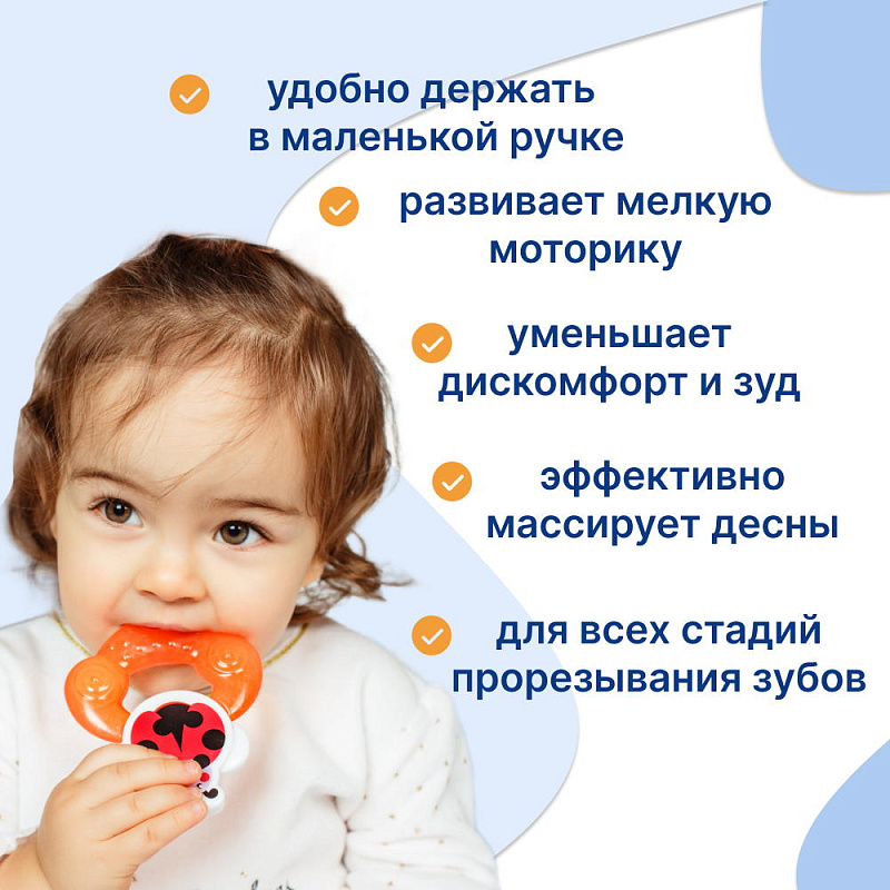 Чтобы помочь ребенку пережить этот период и облегчить болезненное состояние, мы предлагаем новинку - прорезыватель для зубов с изображением божьей коровки, который поможет унять зуд в воспаленных деснах, не нанося им вреда.