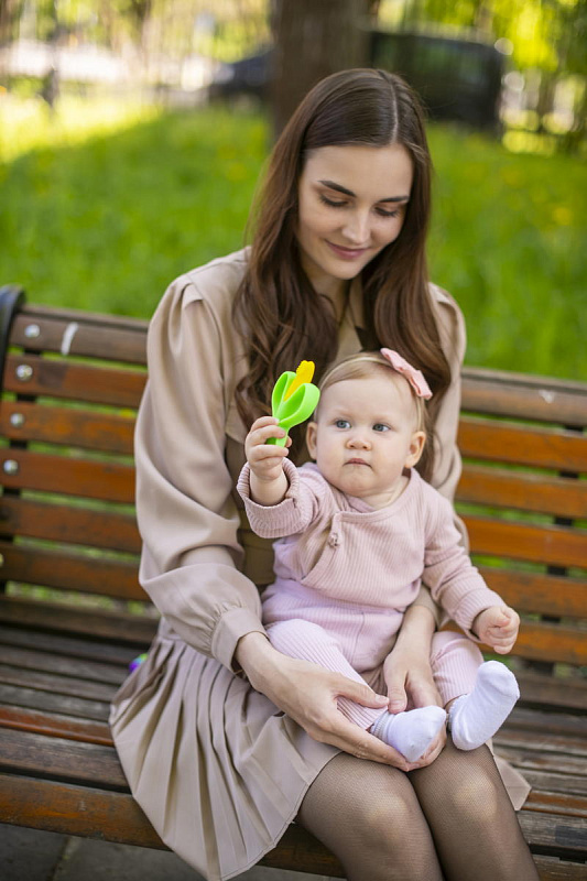 Способствует развитию у малыша хватательного рефлекса и мелкой моторики.