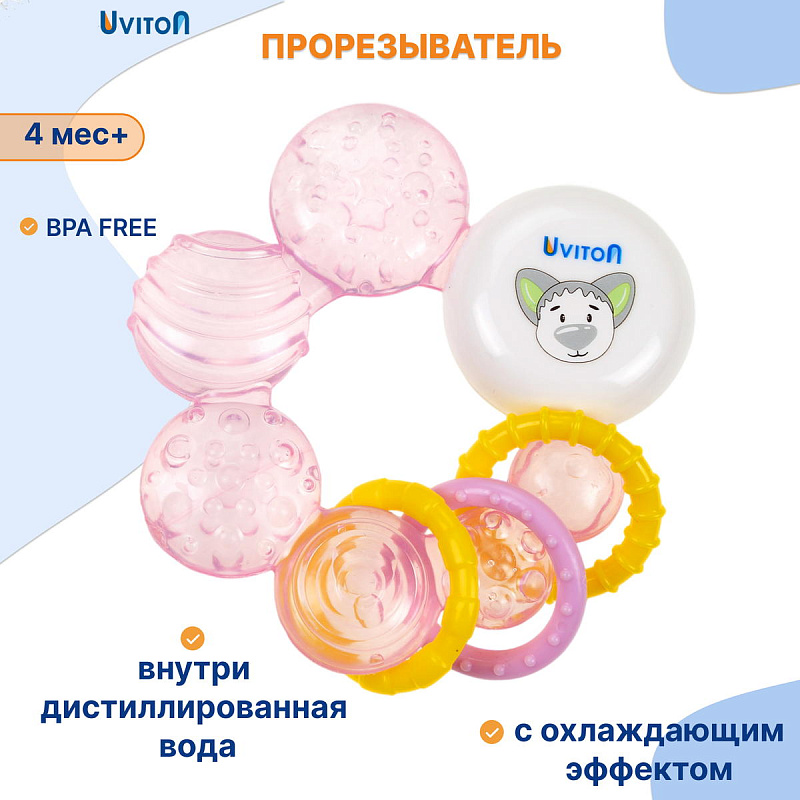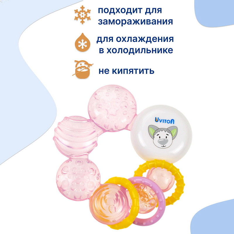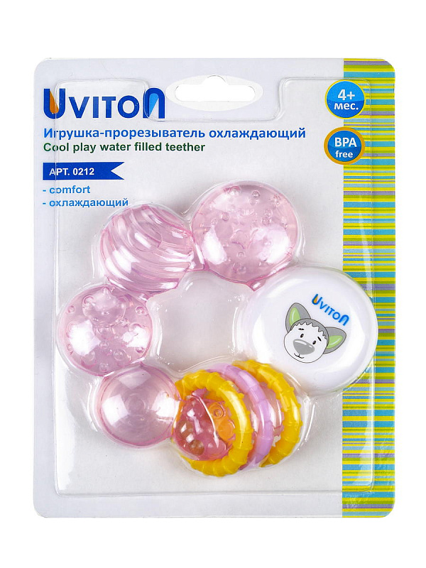 Прорезыватель заполнен дистиллированной водой, которая обеспечивает анестезирующий эффект, если предварительно охладить прорезыватель в холодильнике (не более часа.);