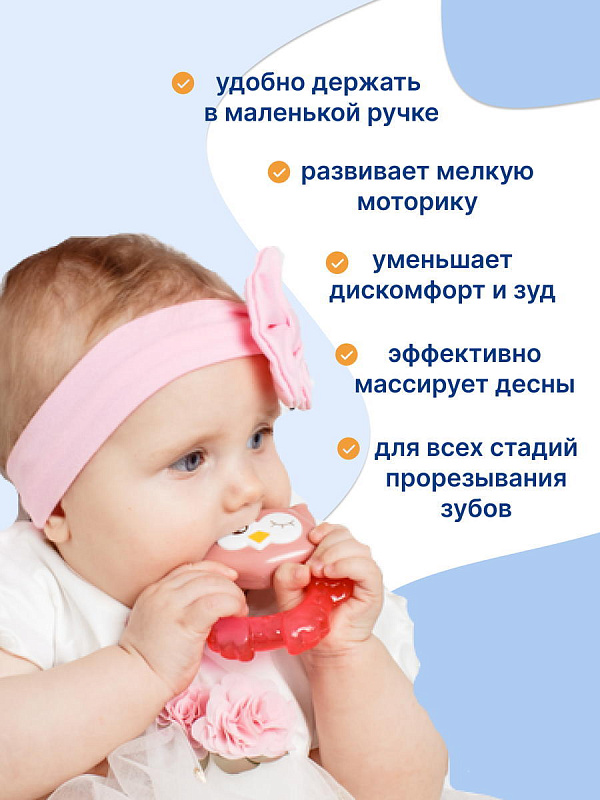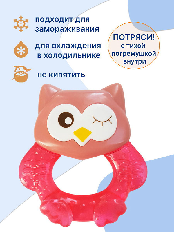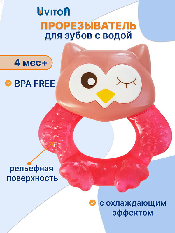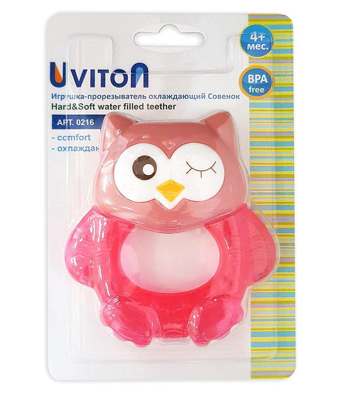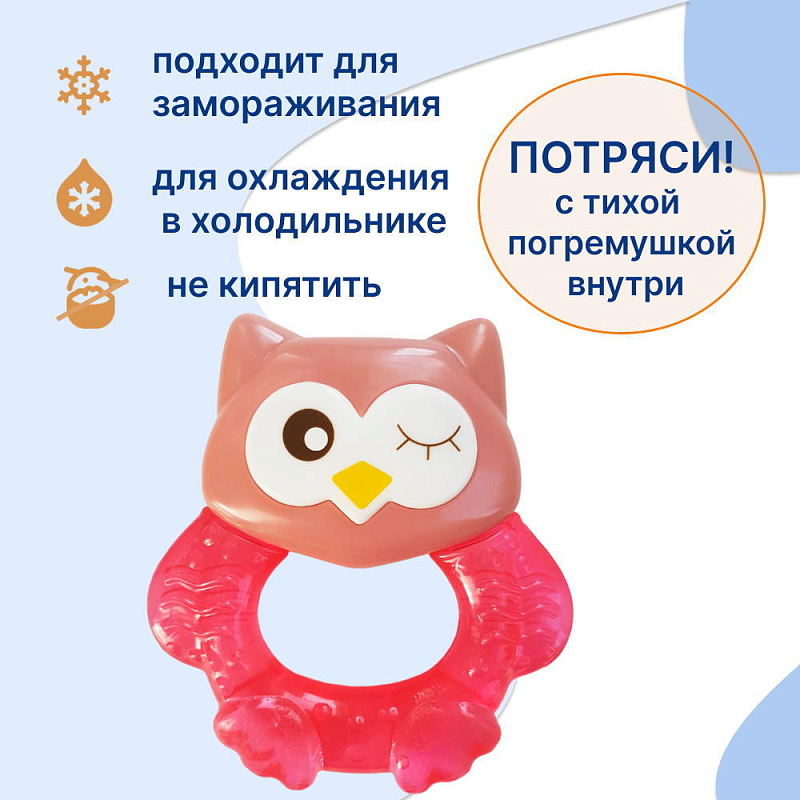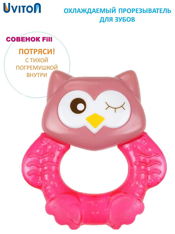Прорезыватель Совенок Fill от Uviton совмещает в себе функцию прорезывателя и игрушки. Если его потрясти, то будет слышен не громкий звук погремушки. Изготовлен он так, чтобы маленьким ручкам было удобно его удерживать. Внутри прорезыватель заполнен дистиллированной водой, которая обеспечивает анестезирующий эффект, если предварительно охладить его в холодильнике (не более 1 часа). Яркий он обязательно привлечет внимание малыша.