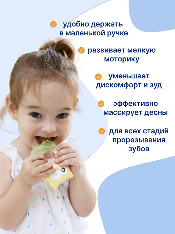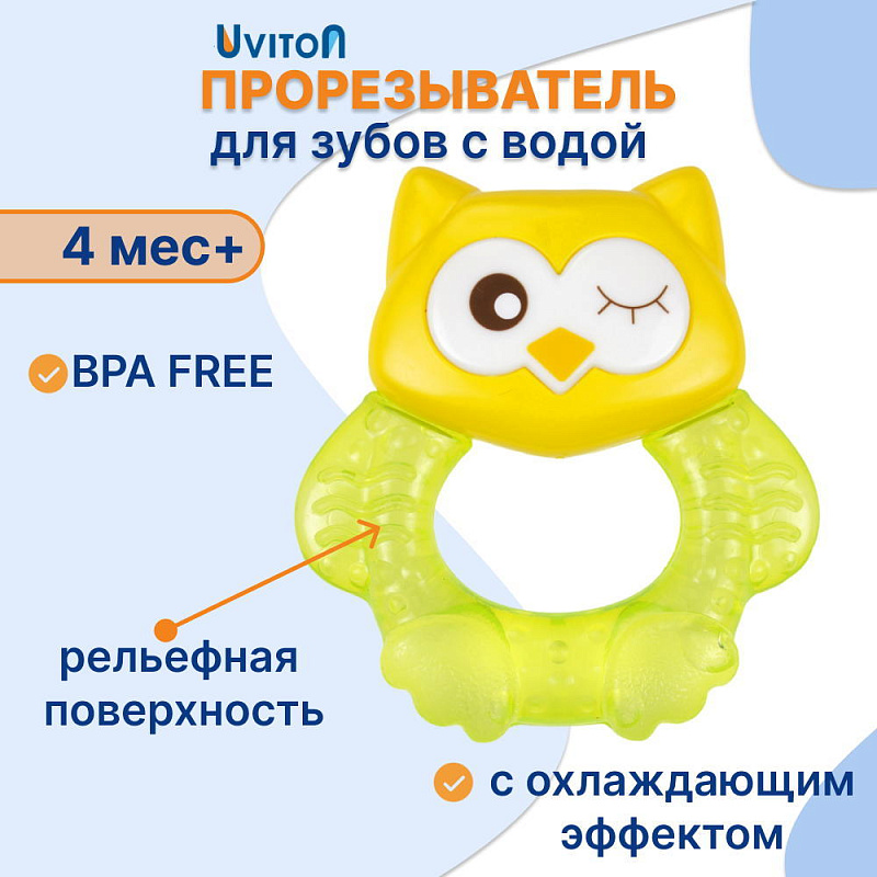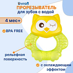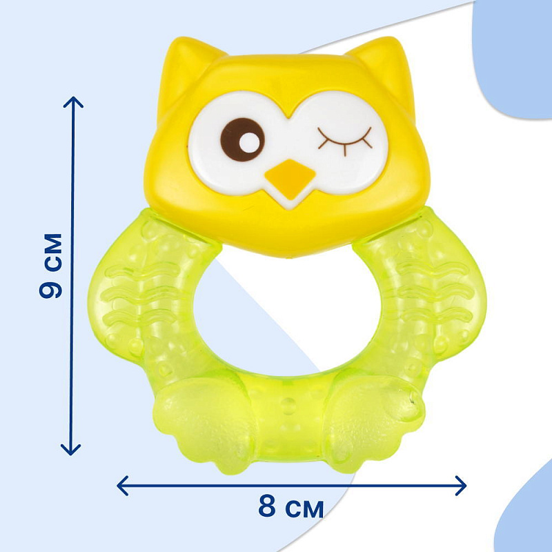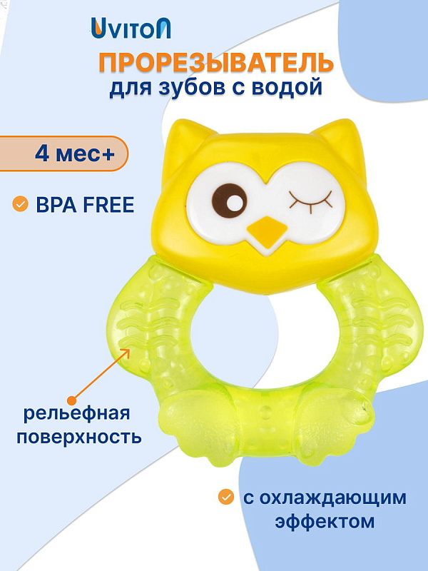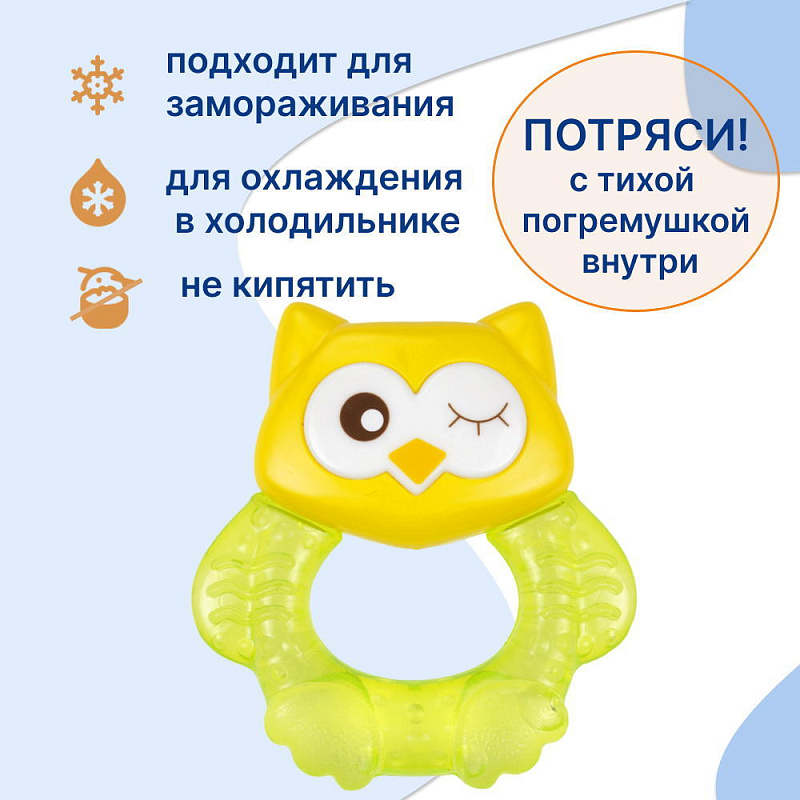 Прорезыватель Совенок Fill от Uviton совмещает в себе функцию прорезывателя и игрушки. Если его потрясти, то будет слышен не громкий звук погремушки. Изготовлен он так, чтобы маленьким ручкам было удобно его удерживать. Внутри прорезыватель заполнен дистиллированной водой, которая обеспечивает анестезирующий эффект, если предварительно охладить его в холодильнике (не более 1 часа). Яркий он обязательно привлечет внимание малыша.
