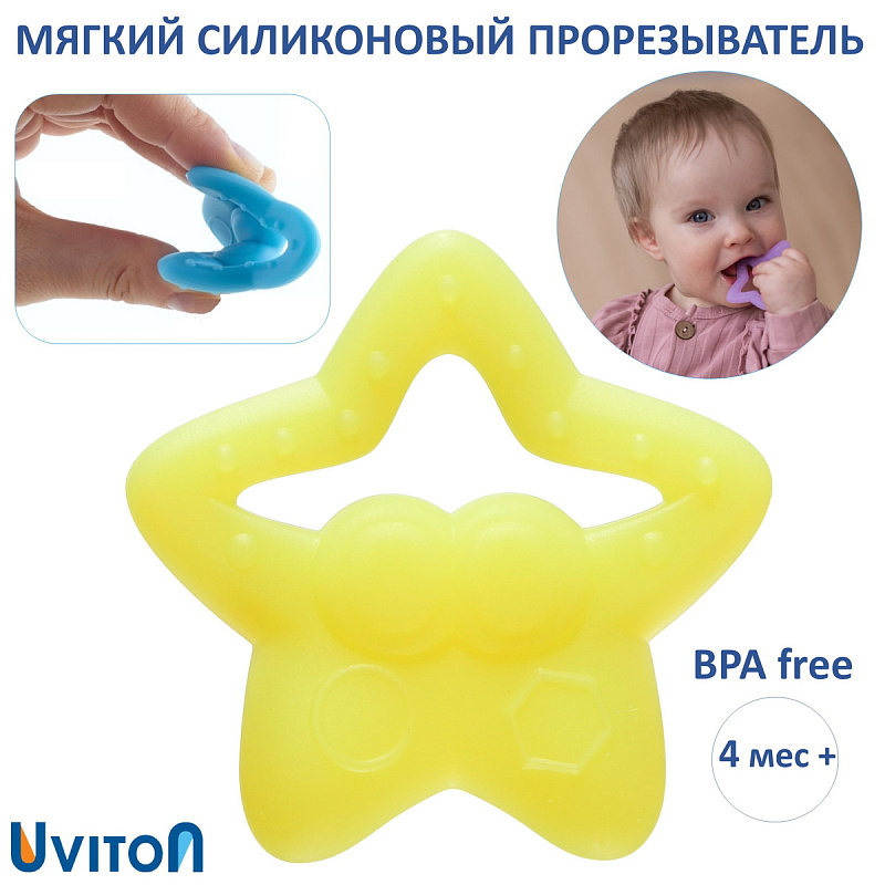 Прорезыватель силиконовый Star от Uviton поможет малышу в период прорезывания первых зубов. С ним легче справится с неприятными ощущениями и дискомфортом. В эти моменты малыш может быть особенно капризным и раздражительным. Чтобы помочь ребенку пережить этот период и облегчить болезненное состояние, прорезыватель допускается использовать с зубным гелем. Прорезыватель мягкий из пищевого силикона, поможет унять зуд в воспаленных деснах не нанося им вреда. В период облегчения с жирафиком так интересно играть и изучать цвета, он будет дарить спокойствие малышу. Прорезыватель отлично подходит для самых маленьких малышей, у которых только начинаются резаться зубки.