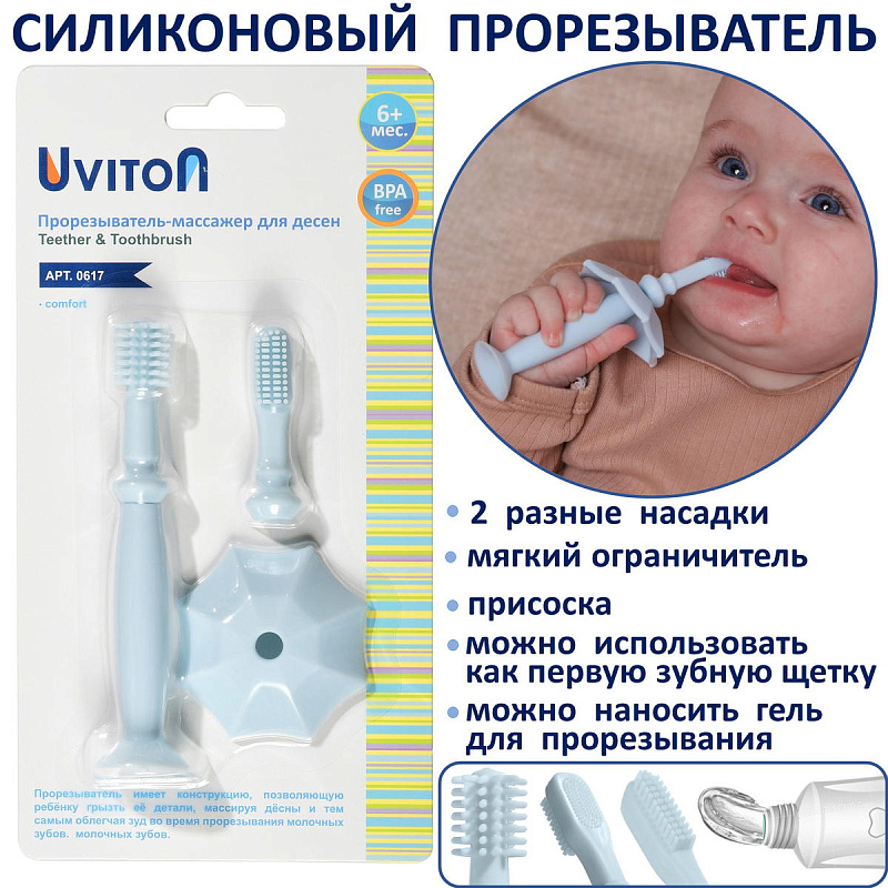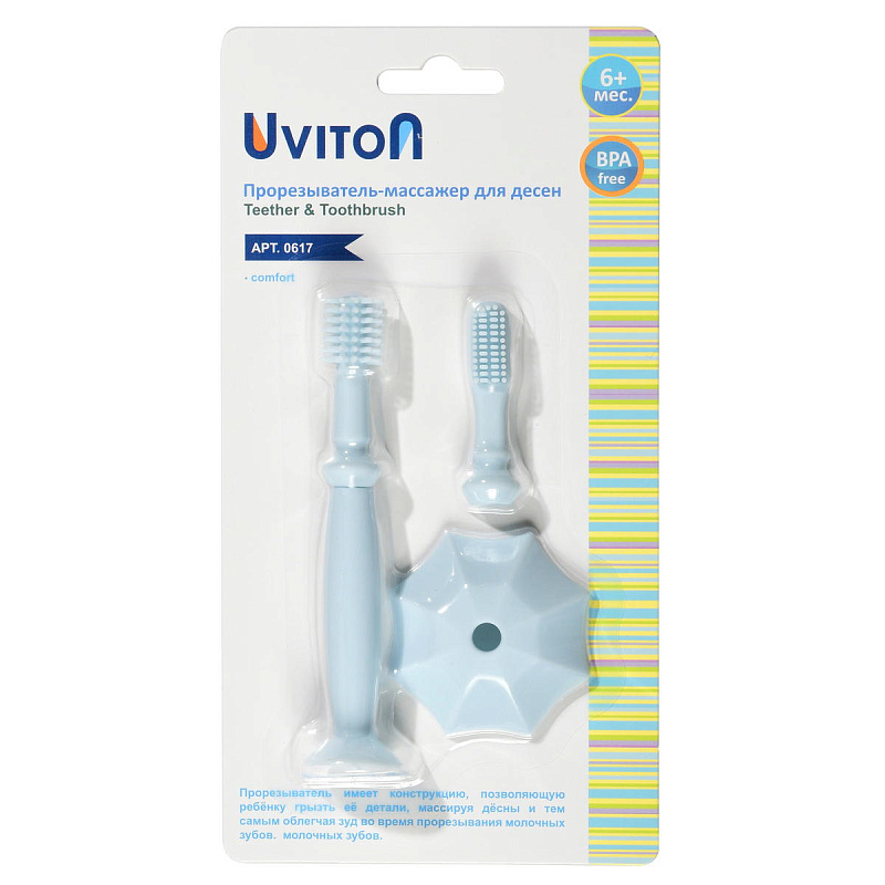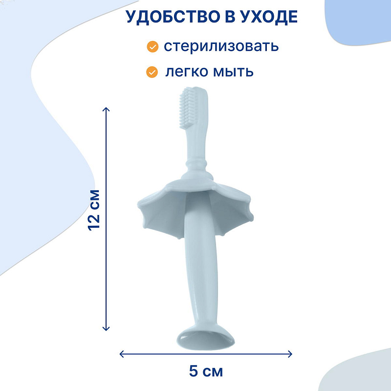 Прорезыватель-массажер для десен Uviton Umbrella в виде зонтика со щеточкой со сменными насадками предназначен для комфортного и безопасного ухода за полостью рта ребенка.