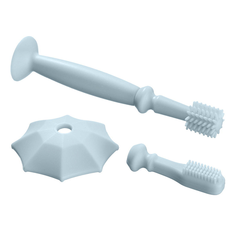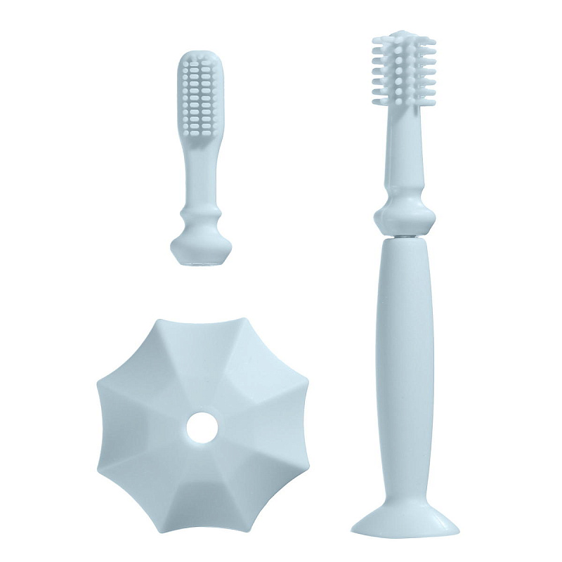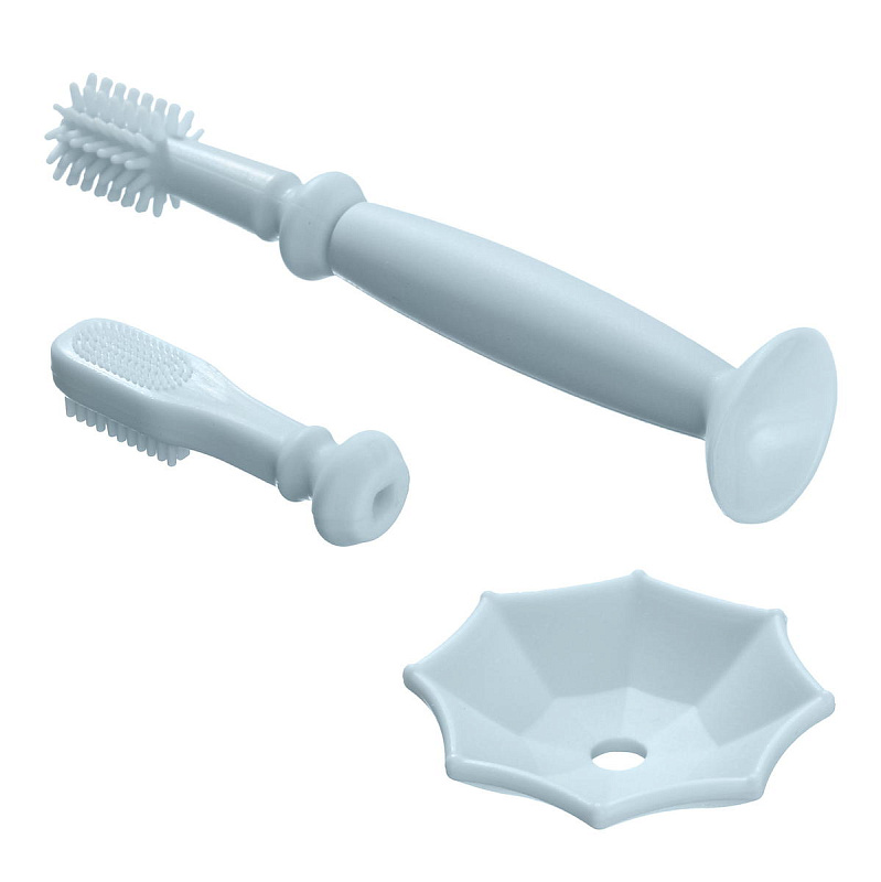 первая щеточка специальной формы массирует десны и предназначена для детей, у которых еще нет зубов;