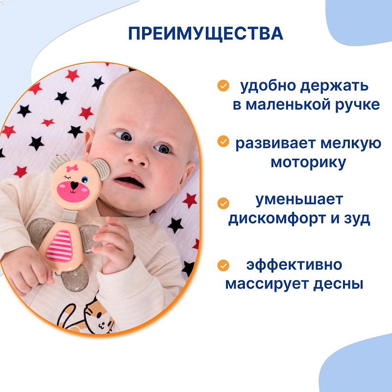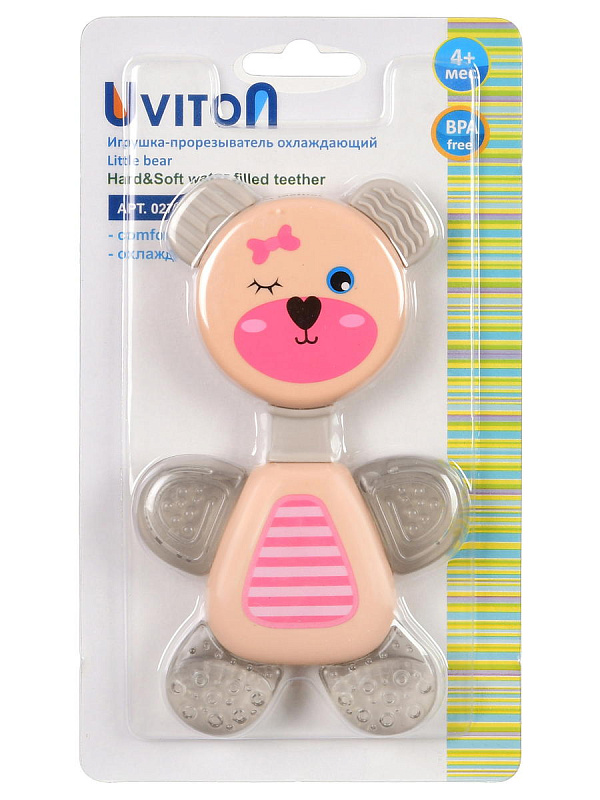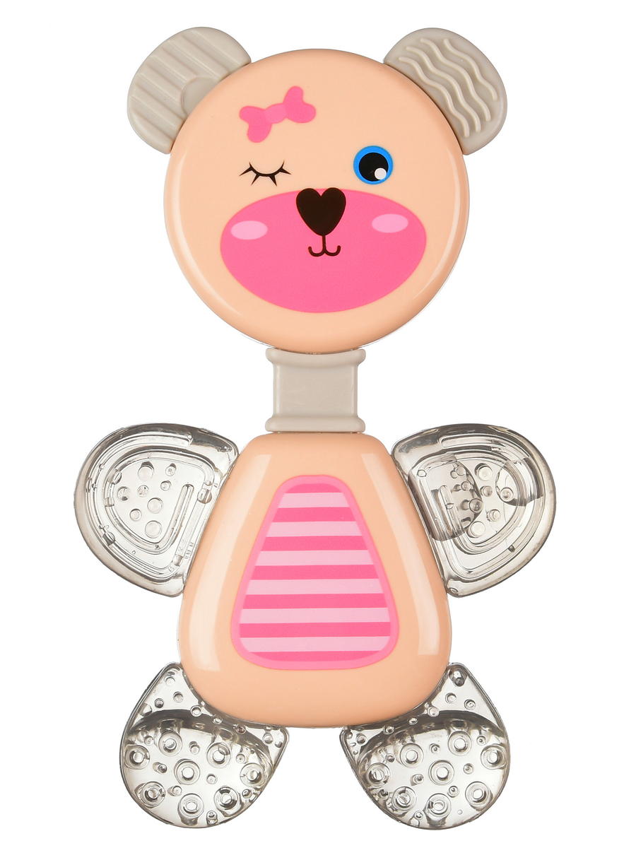 Веселые и яркие медвежата порадуют Вашего ребенка. Ушки и лапки медвежонка выполнены из мягкого материала и имеют рельефную поверхность, позволяющую грызть их и тем самым массировать раздраженные десны облегчая зуд при прорезывании зубов. Безвредный материал и округлая форма без острых краев гарантирует безопасность для малыша.