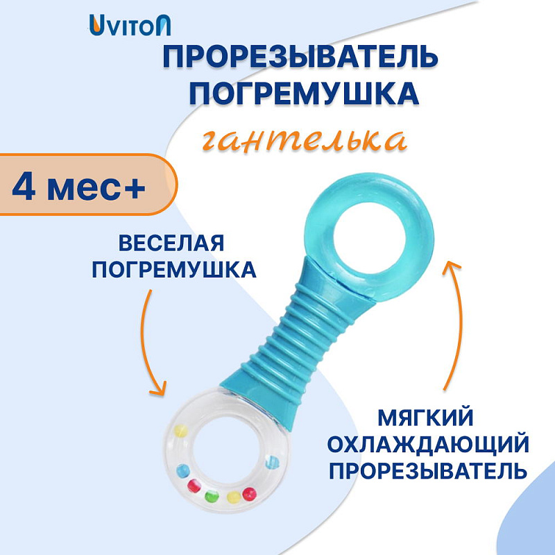 Прорезыватель-погремушка «Гантелька» от Uviton имеет конструкцию, позволяющую ребёнку грызть её детали, массируя дёсны и тем самым облегчая зуд во время прорезывания молочных зубов. Доставит малышу и пользу, и радость.