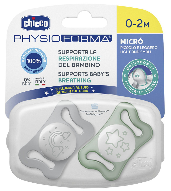 Пустышка Chicco PhysioForma Micro силиконовая 0-2 мес, 2 шт. Glow