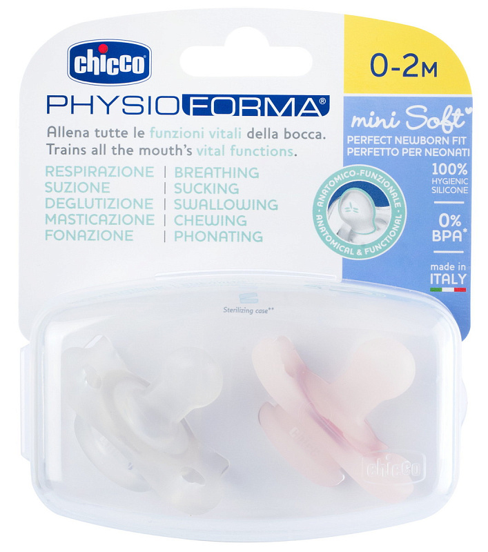 Доказанные исследования показывают, что соски Chicco PhysioForma® тренируют все жизненно важные функции рта для здорового роста: дыхание, сосание, глотание, жевание и фонетическую деятельность.