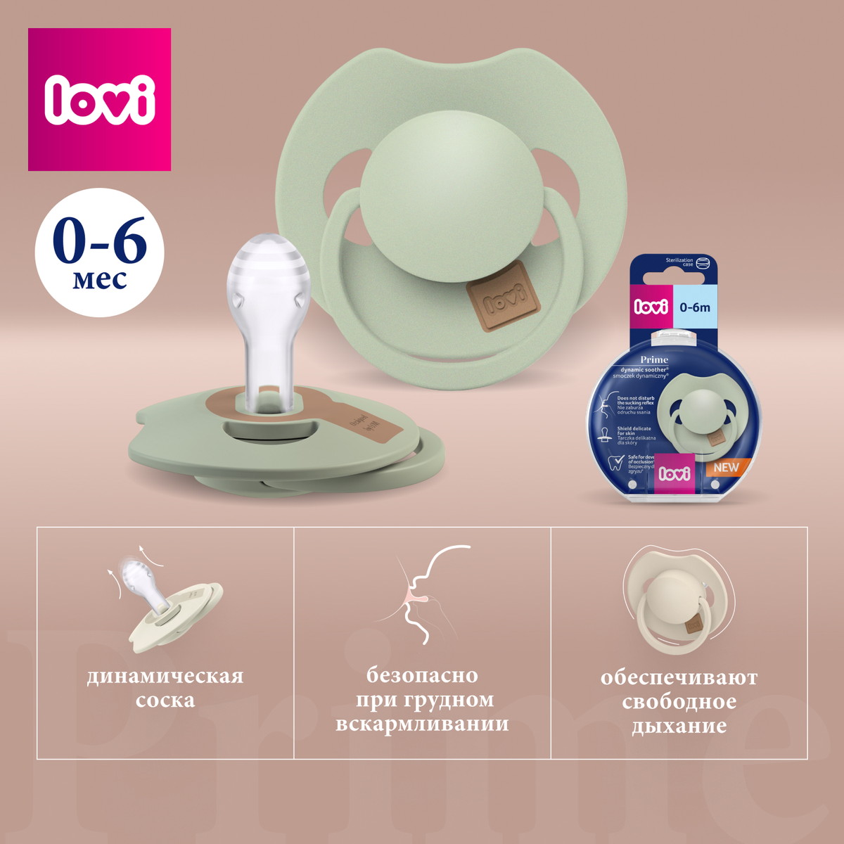 Пустышка динамическая Lovi Prime силиконовая 0-6 мес 34/412 фисташковый