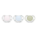 Соска физиологической формы изготовлена из 100% пищевого силикона. Корпус пустышки имеет специальные вентиляционные отверстия и не вызывает раздражения вокруг рта.