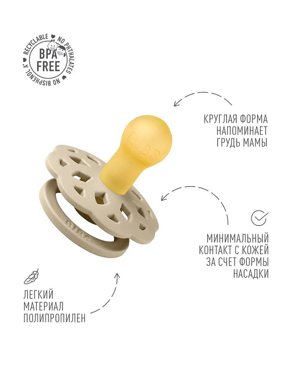 Пустышки BIBSизготавливаются из экологичных, на 100% безопасных материалов. Сосок у пустышки сделан из натурального каучука (латекса), а защитная накладка (шилдик) – из полипропилена.