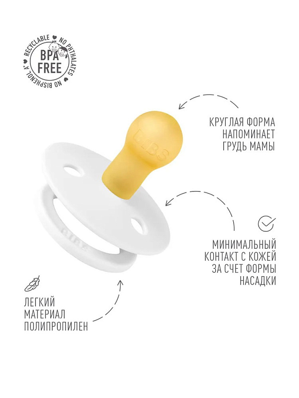 Пустышки BIBS изготавливаются из экологичных, на 100% безопасных материалов. Сосок у пустышки сделан из натурального каучука (латекса), а защитная накладка (шилдик) — из полипропилена. Изогнутая форма накладки минимизирует контакт с чувствительной и нежной кожей вокруг рта ребенка.