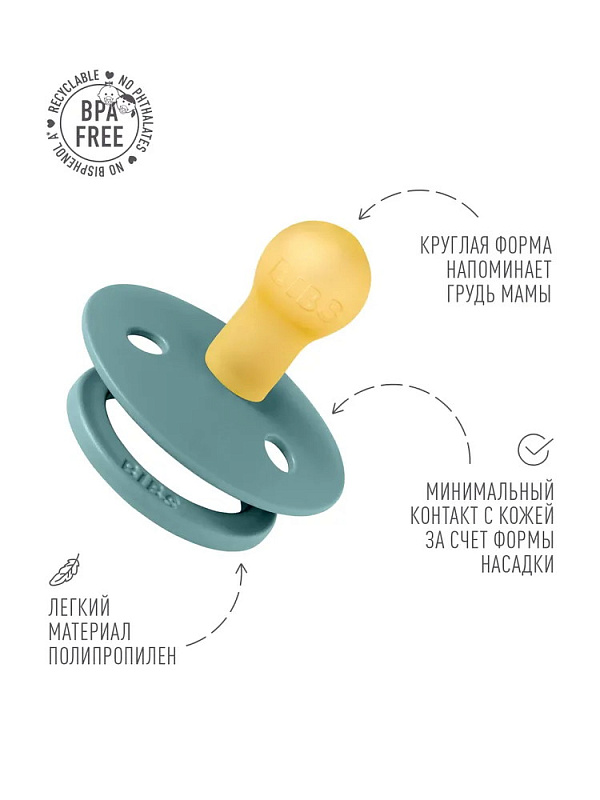 Пустышки BIBS изготавливаются из экологичных, на 100% безопасных материалов. Сосок у пустышки сделан из натурального каучука (латекса), а защитная накладка (шилдик) — из полипропилена. Изогнутая форма накладки минимизирует контакт с чувствительной и нежной кожей вокруг рта ребенка.