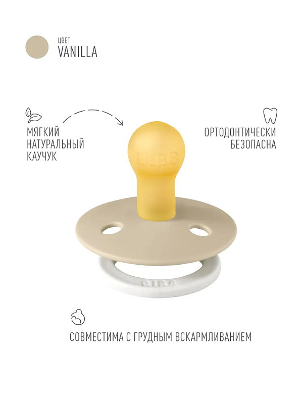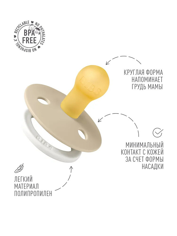 Пустышки BIBS изготавливаются из экологичных, на 100% безопасных материалов. Сосок у пустышки сделан из натурального каучука (латекса), а защитная накладка (шилдик) – из полипропилена. Изогнутая форма накладки минимизирует контакт с чувствительной и нежной кожей вокруг рта ребенка.