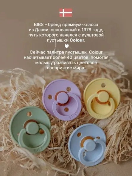 Классический круглый сосок пустышки напоминает сосок матери, благодаря чему BIBS Colour идеально подходит малышам с рождения и совместима с грудным вскармливанием.