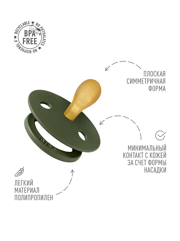 Пустышки BIBS изготавливаются из экологичных, на 100% безопасных материалов. Сосок у пустышки сделан из натурального каучука (латекса), а накладка (шилдик) — из полипропилена. Изогнутая форма накладки минимизирует контакт с чувствительной и нежной кожей вокруг рта ребенка.