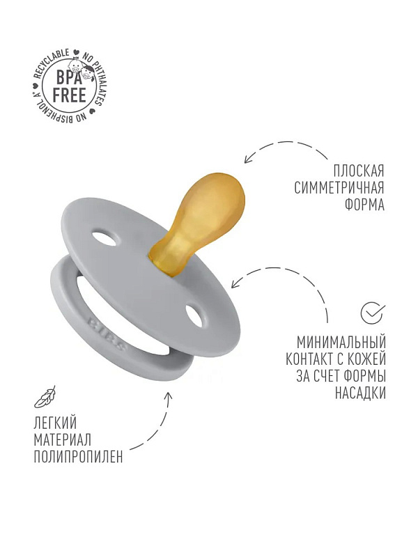 Пустышки BIBS изготавливаются из экологичных, на 100% безопасных материалов. Сосок у пустышки сделан из натурального каучука (латекса), а накладка (шилдик) — из полипропилена. Изогнутая форма накладки минимизирует контакт с чувствительной и нежной кожей вокруг рта ребенка.