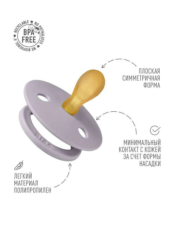 Пустышки BIBS изготавливаются из экологичных, на 100% безопасных материалов. Сосок у пустышки сделан из натурального каучука (латекса), а накладка (шилдик) — из полипропилена. Изогнутая форма накладки минимизирует контакт с чувствительной и нежной кожей вокруг рта ребенка.