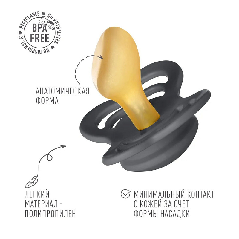 Пустышки BIBS изготавливаются из экологичных, на 100% безопасных материалов. Сосок выполнен из натурального каучука (латекса), а защитная накладка (шилдик) — из полипропилена. Дизайн накладки продуман таким образом, чтобы минимизировать контакт с чувствительной и нежной кожей вокруг рта ребенка.