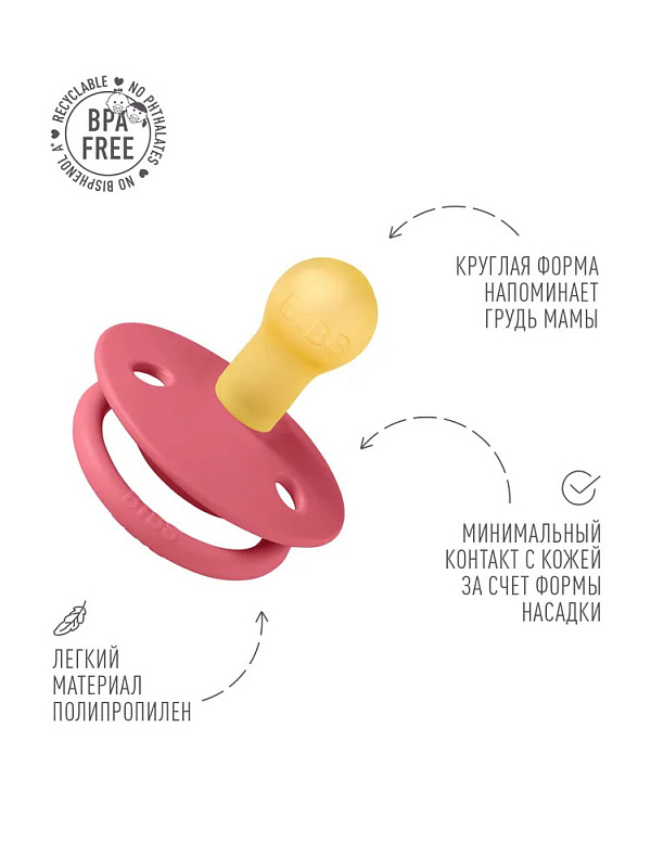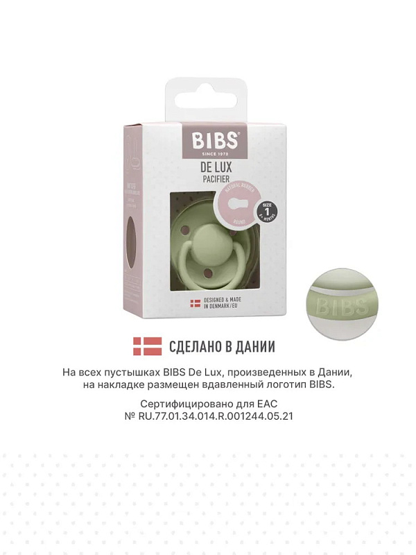 Пустышки BIBSизготавливаются из экологичных, на 100% безопасных материалов. Сосок выполнен из натурального каучука (латекса), а защитная накладка (шилдик) и ручка — из полипропилена. Изогнутая форма накладки с тремя круглыми отверстиями минимизирует контакт с чувствительной и нежной кожей вокруг рта ребенка.
