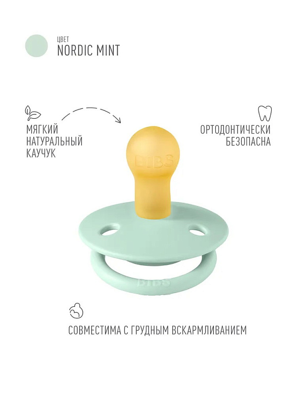 Пустышки BIBSизготавливаются из экологичных, на 100% безопасных материалов. Сосок выполнен из натурального каучука (латекса), а защитная накладка (шилдик) и ручка — из полипропилена. Изогнутая форма накладки с тремя круглыми отверстиями минимизирует контакт с чувствительной и нежной кожей вокруг рта ребенка.
