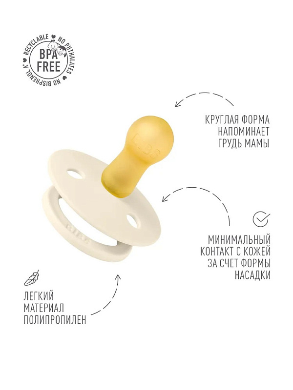 Пустышки BIBS изготавливаются из экологичных, на 100% безопасных материалов. Сосок у пустышки сделан из натурального каучука (латекса), а защитная накладка (шилдик) — из полипропилена. Изогнутая форма накладки с отверстиями минимизирует контакт с чувствительной и нежной кожей вокруг рта ребенка.