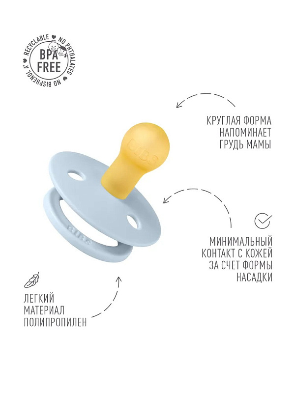 Пустышки BIBS изготавливаются из экологичных, на 100% безопасных материалов. Сосок у пустышки сделан из натурального каучука (латекса), а защитная накладка (шилдик) — из полипропилена. Изогнутая форма накладки с отверстиями минимизирует контакт с чувствительной и нежной кожей вокруг рта ребенка.