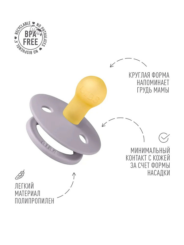 Пустышки BIBS изготавливаются из экологичных, на 100% безопасных материалов. Сосок у пустышки сделан из натурального каучука (латекса), а защитная накладка (шилдик) — из полипропилена. Изогнутая форма накладки с отверстиями минимизирует контакт с чувствительной и нежной кожей вокруг рта ребенка.