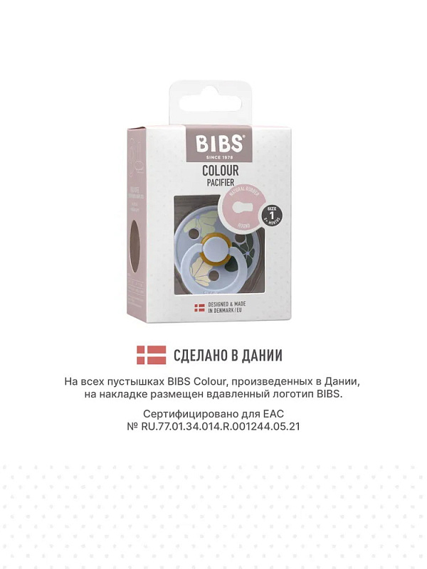Пустышки BIBS изготавливаются из экологичных, на 100% безопасных материалов. Сосок у пустышки сделан из натурального каучука (латекса), а защитная накладка (шилдик) — из полипропилена. Изогнутая форма накладки с отверстиями минимизирует контакт с чувствительной и нежной кожей вокруг рта ребенка.