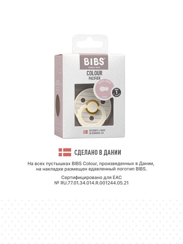 Пустышки BIBS изготавливаются из экологичных, на 100% безопасных материалов. Сосок у пустышки сделан из натурального каучука (латекса), а защитная накладка (шилдик) — из полипропилена. Изогнутая форма накладки с отверстиями минимизирует контакт с чувствительной и нежной кожей вокруг рта ребенка.