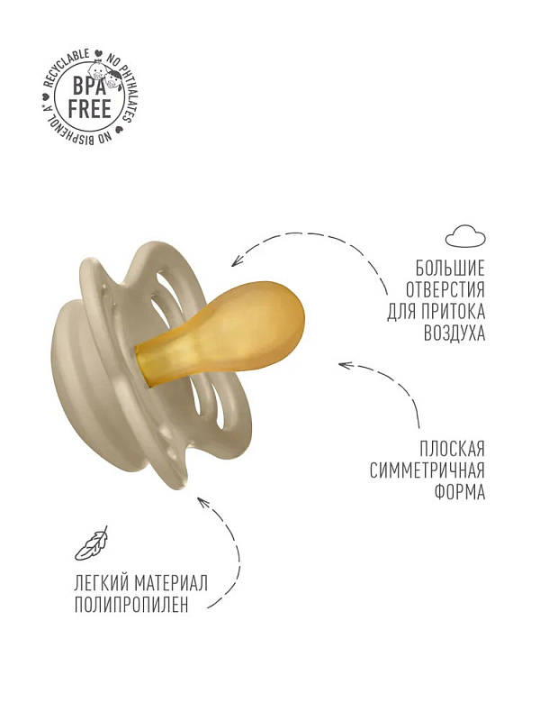 Пустышки BIBS изготавливаются из экологичных, на 100% безопасных материалов. Сосок выполнен из натурального каучука (латекса), а защитная накладка (шилдик) — из полипропилена. Форма накладки минимизирует контакт с чувствительной и нежной кожей вокруг рта ребенка.