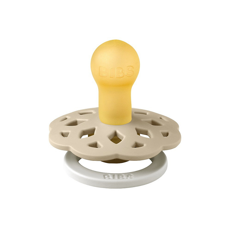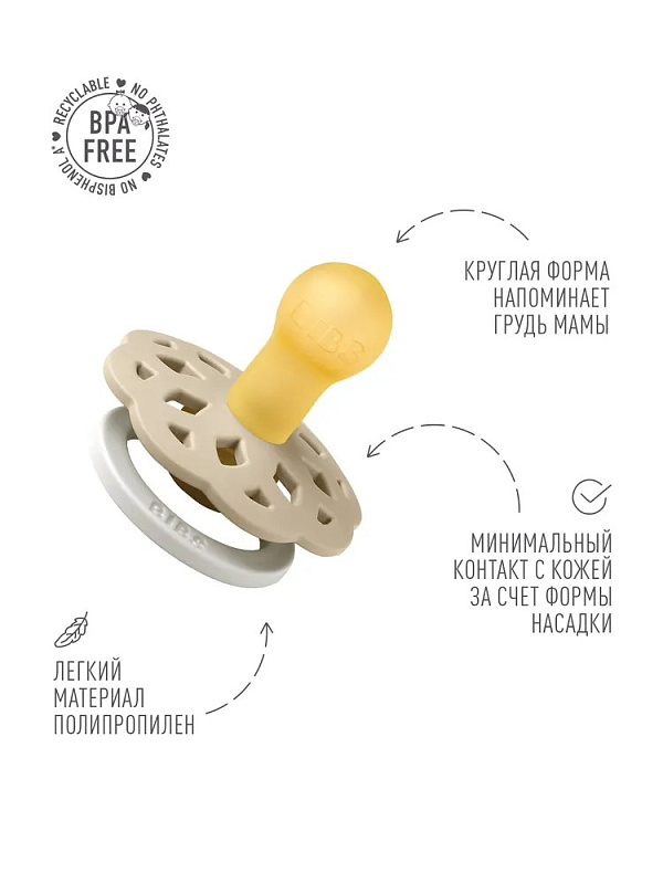 Пустышки BIBS изготавливаются из экологичных, на 100% безопасных материалов. Сосок у пустышки сделан из натурального каучука (латекса), а защитная накладка (шилдик) – из полипропилена.