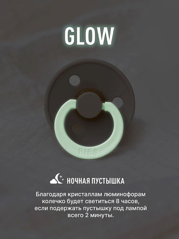 Колечко пустышки De Lux Glow излучает мягкий свет и её легко найти в тёмной комнате. Достаточно двух минут под лампой, чтобы «зарядить» пустышку. Свечение колечку придают кристаллы люминофоров.