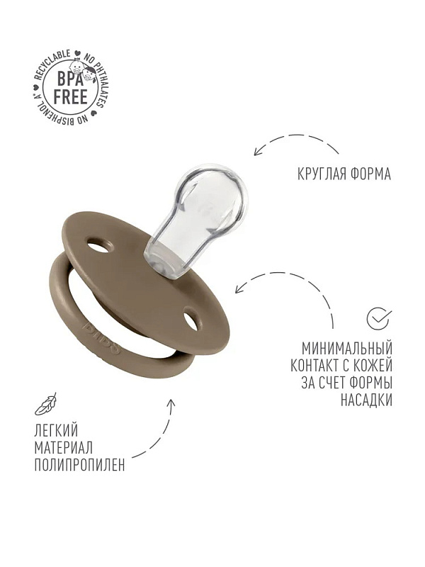 Классический круглый сосок пустышки BIBS De Lux по форме и размеру напоминает сосок матери, благодаря чему она идеально подходит малышам с рождения.